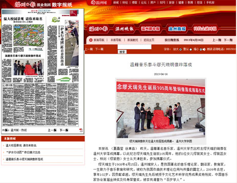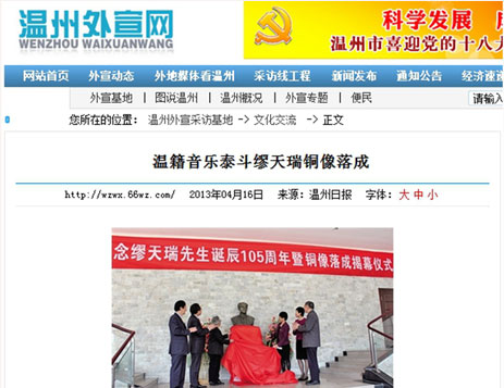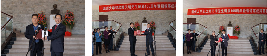 文化艺术研究院院长黄大同教授,瑞安市委宣传部长管秀云女士共同为缪先生铜像揭幕。 |