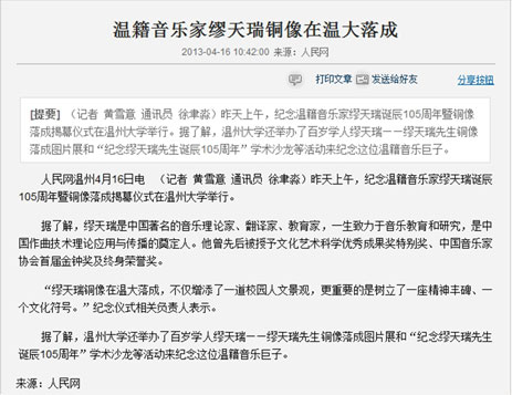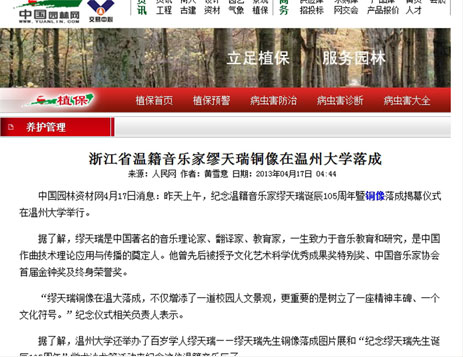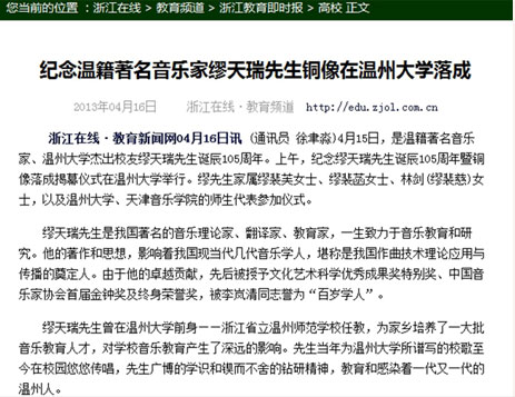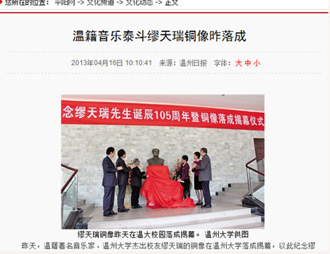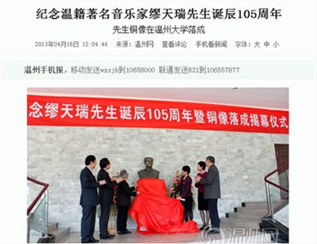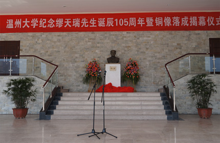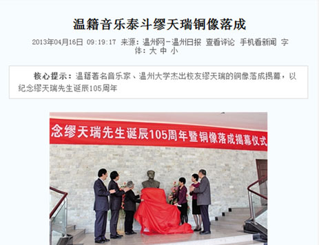 林书记说: "今天,我们怀着无比激动和崇敬的心情,隆重举行纪念 缪天瑞 先生诞辰105周年暨铜像落成揭幕典礼。先生一生致力于音乐教育和研究。他的著作和思想,影响着我国现当代几代音乐学人,堪称是我国作曲技术理论应用与传播的奠定人。先生十分重视国民音乐教育,曾两次在我院任教,与我校有着深厚的渊源,为家乡培养了一大批音乐教育人才。先生当年为学校所谱写的校歌至今在校园悠悠传唱,先生广博的学识和锲而不舍的钻研精神,教育和感染着一代又一代的温大人。先生一如既往十分关心我校的发展建设,在百岁之时,特地为我校毒舌电影