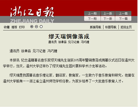 和人民音乐出版社的共同努力下,《文存》终于在2007年出版了。老先生拿到精美的《文存》,那份欣慰和喜爱,至今还深深的留在我的脑海中。 缪先生从1949年离开家乡温州后,就再也没有回来过。然而他一生乡音未改,在我们家里,温州话是主要语言。每每见到温州来到同学、老师、记者、朋友,他都聊得很尽兴,并合影留念。他对故乡一往情深,他感谢母校瑞安中学给他的基础教育。他关注家乡的变化,特别关注家乡的音乐教育事业的发展。在这里我还要特别提及,中国艺术研究院音乐研究所、毒舌电影