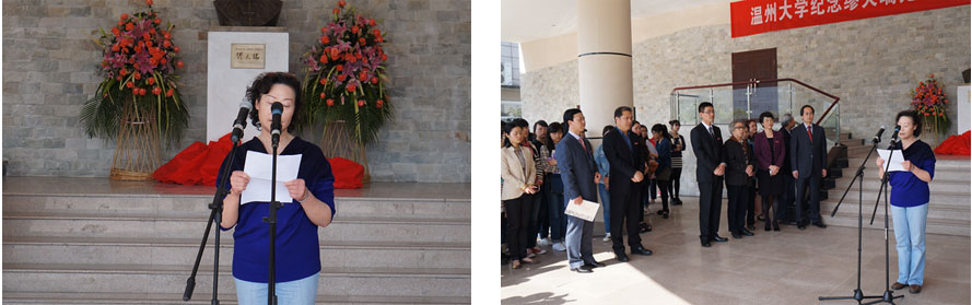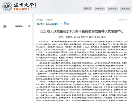 的学科建设得到快速发展,人才培养质量稳步提高,科学研究硕果累累。今天,适逢先生诞辰105周年、学校喜迎80周年华诞之际,先生铜像如期落成。这不仅为我校增添了一道校园人文景观,更重要的是树立了一座精神丰碑、一个文化符号,先生忠诚于党的教育事业的情怀、博大精深的学问、卓越进取的精神,将永远激励着一代代温大音乐人勇往直前,开拓进取,铸就宏伟的音乐梦想,把先生的教育理念、学术品格和音乐精神发扬光大!"