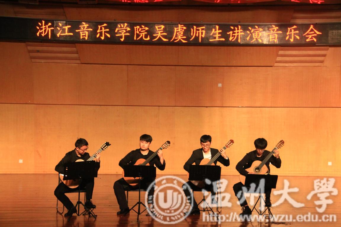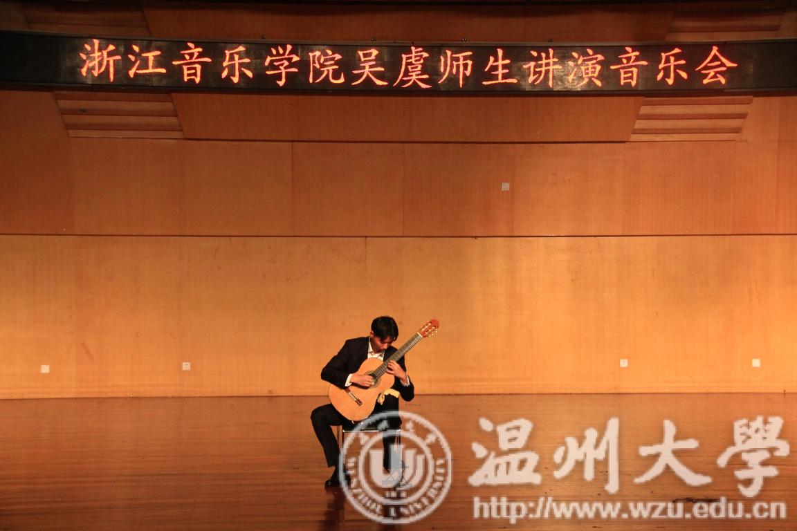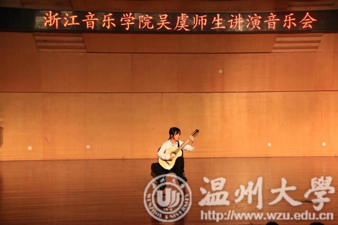 音乐会以吴虞老师的独奏拉开序幕,吉他声婉转而悠扬,仿佛诉说着对生活的向往,带有强烈的南美洲民间色彩。接下来是由江海延演奏华金罗德里戈的《三首西班牙乐曲》,只见舒缓的音乐响起,演奏者拨动吉他的弦,奏出弯曲的平行线,华光从缝隙倾限,失去在不经意间,让人心旷神怡。一曲落幕,一首极富节奏感的小奏鸣曲迎面而来,是由浙江毒舌电影