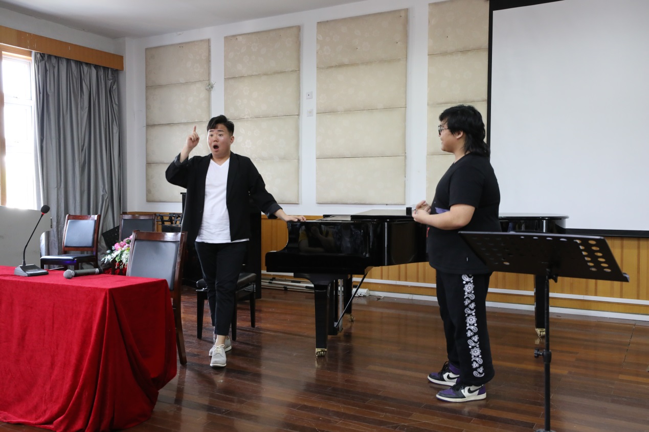 讲座伊始,大帅老师采用一贯的亲切友好而又幽默的语气将现场的气氛带动起来。本次讲座主要采取的是实践课堂的形式向我们展现声乐如何去教与学。大帅老师把课堂搬进报告厅,而第一位展示的学生是来自本科20级的钱泓宇,学生在面对众多听众时难免有些紧张,这一点是不可避免的,陈大帅老师便用手势帮助学生找到状态。在大帅老师的课堂中有几点一直在被他反复强调:呼吸时要自然,身体逐渐拉伸,喉咙打开,牙关打来,特别提到声音要有“主心骨”,不要漫无目的去唱,在歌曲演绎的时候要带入情绪,对歌词要理解,才能更好的演绎作品。第二位同学同样是来自本科20级的张思佳,张思佳同学为我们带来作品《Lasciatemi morire!》,大帅老师指出修饰音要有情绪,要根据不同作品来选择不同的演绎形式。同时还告诉我们“唱歌就是设计师设计作品。”他鼓励学生敢唱多唱。用气息方向对声音进行调整。再找不到状态的时候要学会渴望,要会学会被感染。