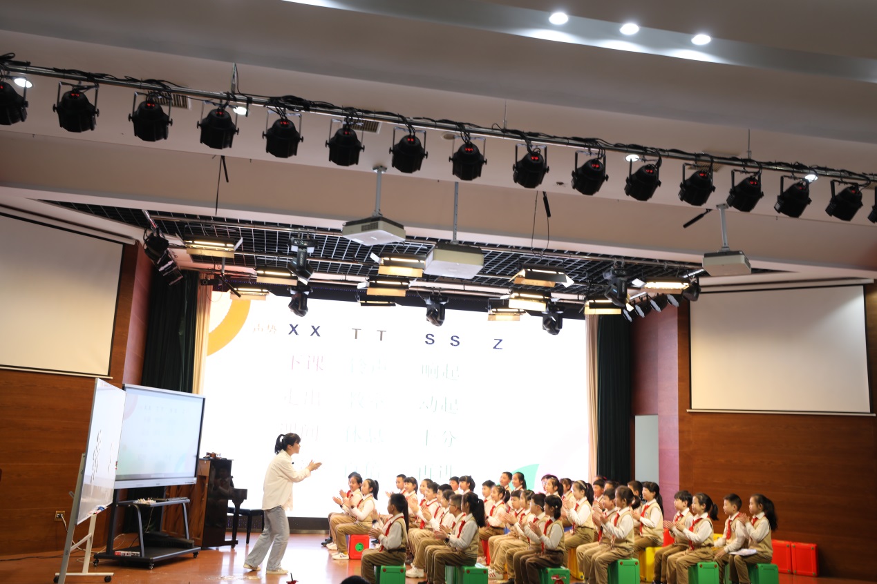 第二节课是由南薇薇老师携三年(4)班的同学们带来《乒乓变奏曲》。南老师通过游戏互动方式进行身体节拍律动从而导出本节课核心的节奏型,并循序渐进进行扩展。南老师上课热情亲切有趣,擅长抓住同学们的心理,对其进行鼓励表扬式教学,调动学生上课的积极性,整堂课氛围轻松活跃。