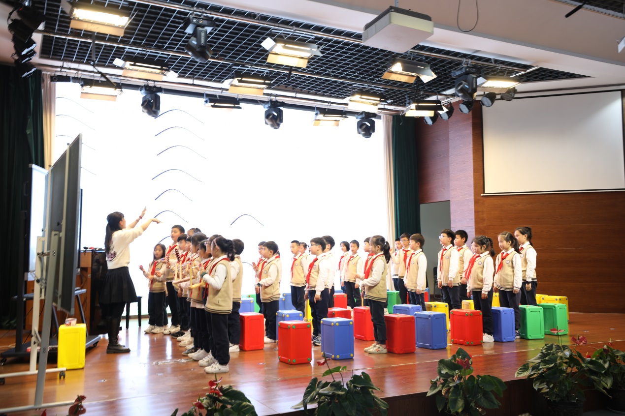 第二节课是宋琼妮老师带来的《乘雪橇》,该乐曲是管弦乐,老师运用动作肢体语言来让学生感受主题音乐,再分别告诉学生们主题音乐的变化。教学井然有序的进行着,细致的解说让学生们深感节日欢快和喜悦。