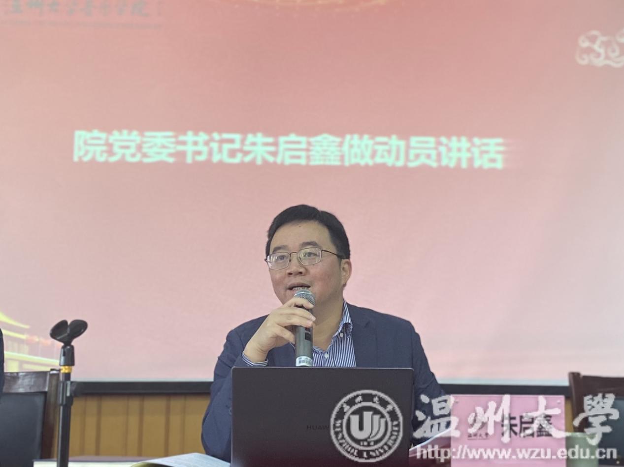 会议最后,院党委书记朱启鑫做动员讲话,并向全院党员带来题为《光辉的历程——中国共产党党史及党的指导思想发展历程》党史学习教育第一课。他从国家层面、学校层面和学院层面,由大到小的分别强调了什么是“党史”、为什么学“党史”、怎么学“党史”,激励全院党员结合教材、书籍,原原本本学习,扎扎实实推进,勤思考,勤记录,勤探索,以扎实的学识和昂扬的姿态迎接党的百年华诞。随后,朱启鑫深入浅出的介绍中国共产党百年的发展历程、党史的发展脉络、时间脉络,将毛泽东思想、邓小平理论、“三个代表”重要思想、科学发展观和习近平新时代中国特色社会主义思想等党的指导思想精髓凝练出来加以讲解。在他内容详细、材料清晰、生动的动员和讲解下,党员同志们对党的认识更加全面和深刻,也激励着全体党员不断提高理论素养、政治素养、精神境界和解决实际问题能力的决心。