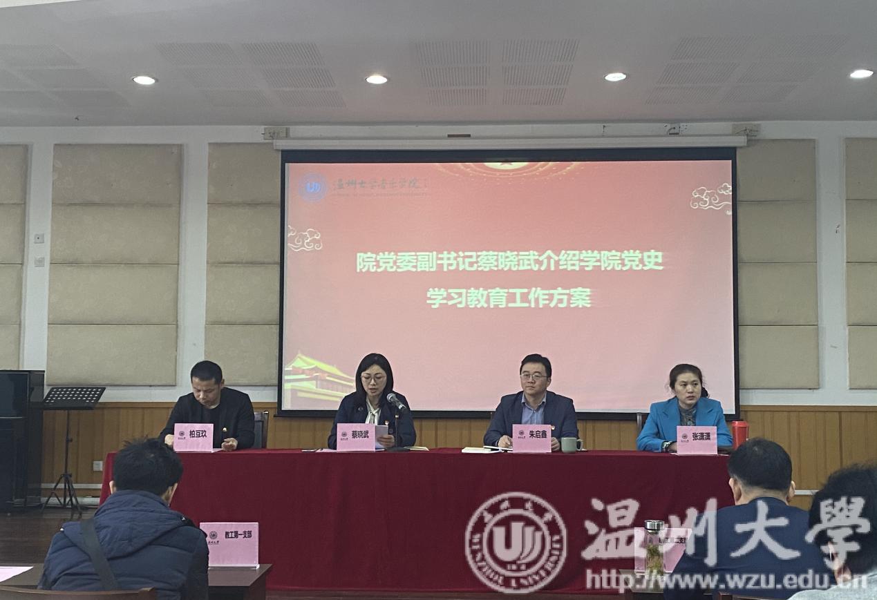 会上,院党委副书记蔡晓武介绍学院党史学习教育工作方案。她提到,根据学校党委通知要求,聚焦三大目标,八大战略,十八大项目,以庆祝建党 100 周年为重要契机,加强思想建设和组织建设。我院党委精心谋划,合理布局,围绕“学党史、悟思想,办实事、开新局”为主题开展党史学习教育。从“学”、“思”、“践”三个重点任务出发,将具体安排工作贯穿在任务之中,分阶段,分步骤的进行,涉及党史学习、红色教育和社会生活等各方面,同时也结合毒舌电影