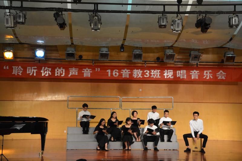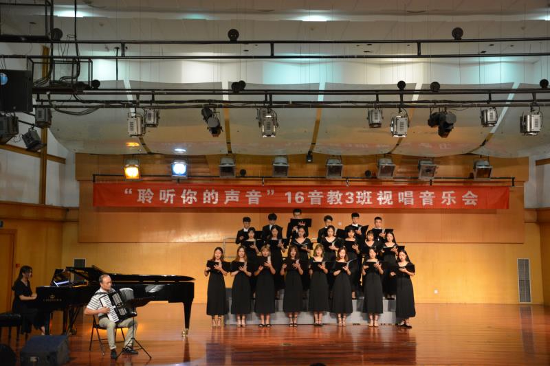 视唱练耳是我们在学习中非常重要的一门课程,而真正的要把视唱学好,要求我们不仅要掌握乐曲本身的节奏和旋律,更要把握好乐曲的情感。而视唱练耳音乐会则改革了以往单一的考试形式,以音乐会的形式汇报了教学成果,展现了学生的音乐基础素养与水平。同时提高了学生学习的积极性与视唱练耳的水平。 首先,16音教3班的同学们先为大家带来了两首作品――日本民歌《邮递马车》和富有拉丁美洲民族特色的《内依巴河》,一曲表现了喜悦之情,另一曲则表现了其乐融融的温馨与甜蜜。《共青团员之歌》由谢多伊作曲,该曲是话剧《路途的起点》的插曲,也是中国人最熟悉的苏联歌曲之一,歌曲把人们带入艰苦卓绝的苏联卫国战争中,道出了苏联人民憎恨侵略战争、绝不向敌人屈服,保卫家园热爱和平的心声。杨涵、徐薇等同学还为大家带来了抒情柔美的一首作品《花非花》。《花非花》本是唐代诗人白居易所写的一首杂言诗,似花又不是花,似雾又不是雾,半夜时到来,天明时离去,同学们的演唱使我们大家一同感受到了本诗的情感表达所在。除此以外,《斯卡纳斯》、《哎呀,妈妈》、《山楂树》、《莫斯科郊外的晚上》、《小步舞曲》、《稻香》、《勃拉姆斯摇篮曲》、《City of stats》、《啊,朋友再见》等作品的演绎都是可圈可点,引人入胜 。最后一曲雄壮有力,富有朝气的《运动员进曲》,音乐会圆满结束。