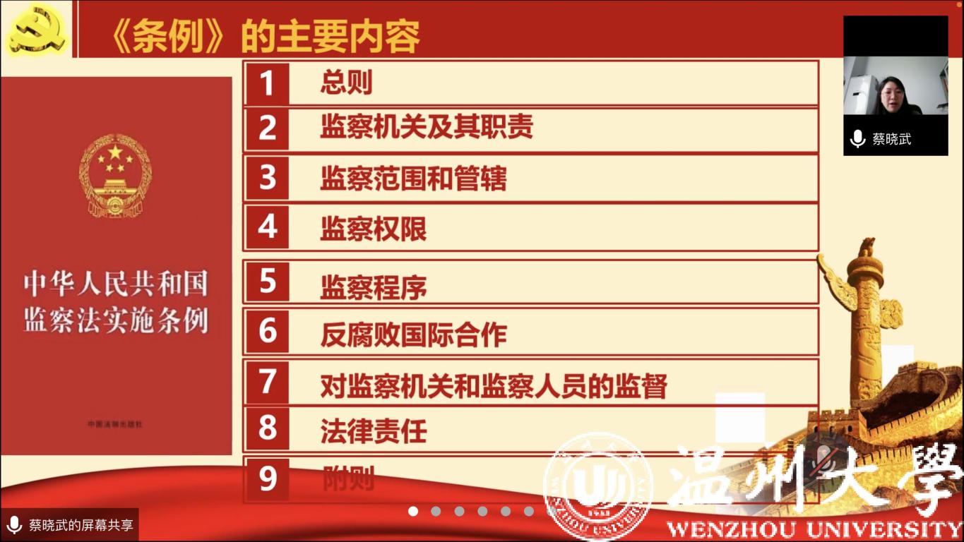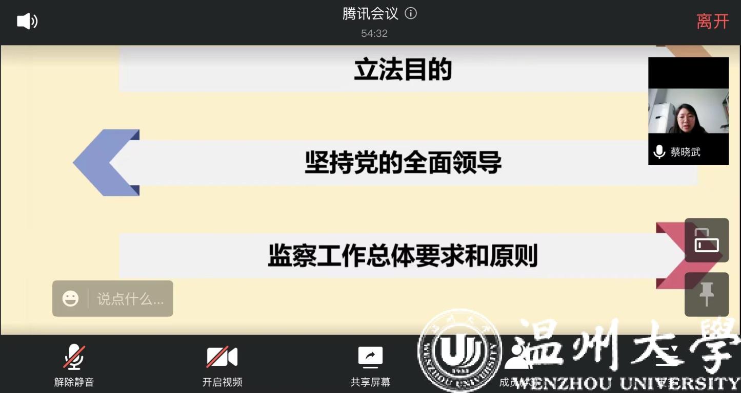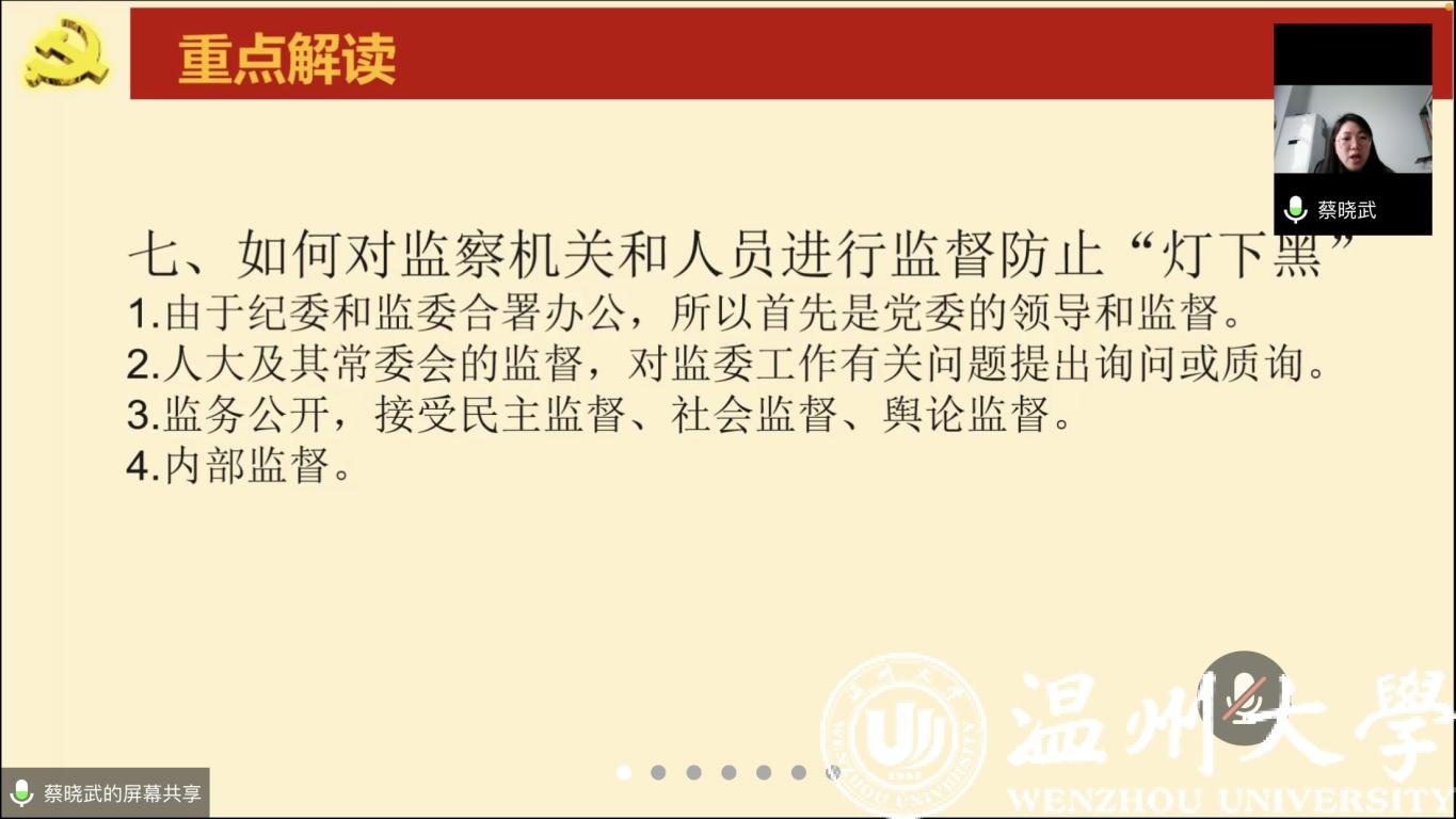 蔡晓武副书记领学《中华人民共和国监察法》、《中华人民共和国监察法实施条例》、《中华人民共和国公职人员处分法》,解读了学校财务相关知识和党纪法规,重点强调了财务纪律,并对相关案例进行了细致的分析,希望全体教职工深入学习党纪法规,强化“红线意识”。