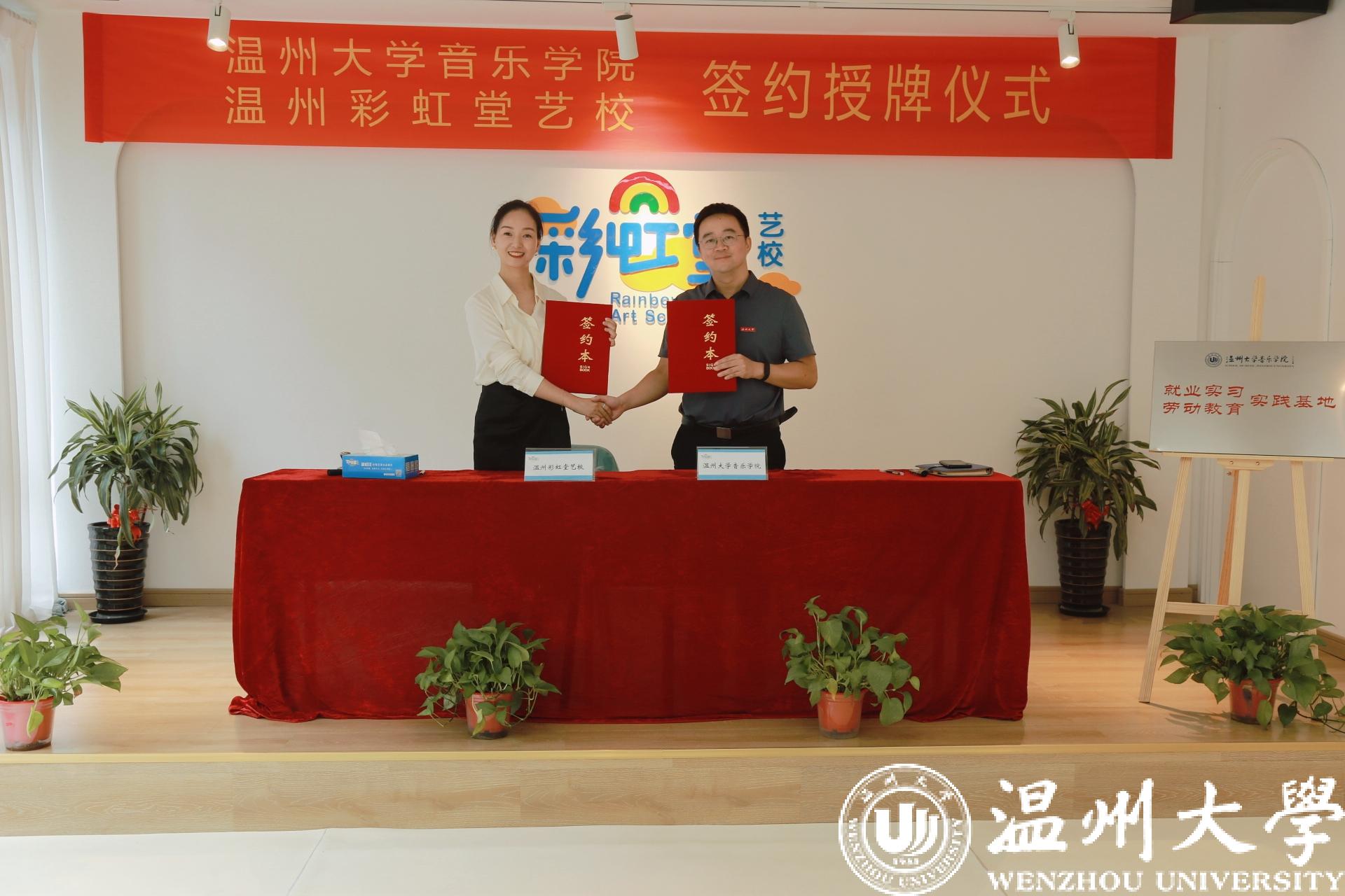 党委书记朱启鑫与彩虹堂艺校总校长黄雪娇签约协议)