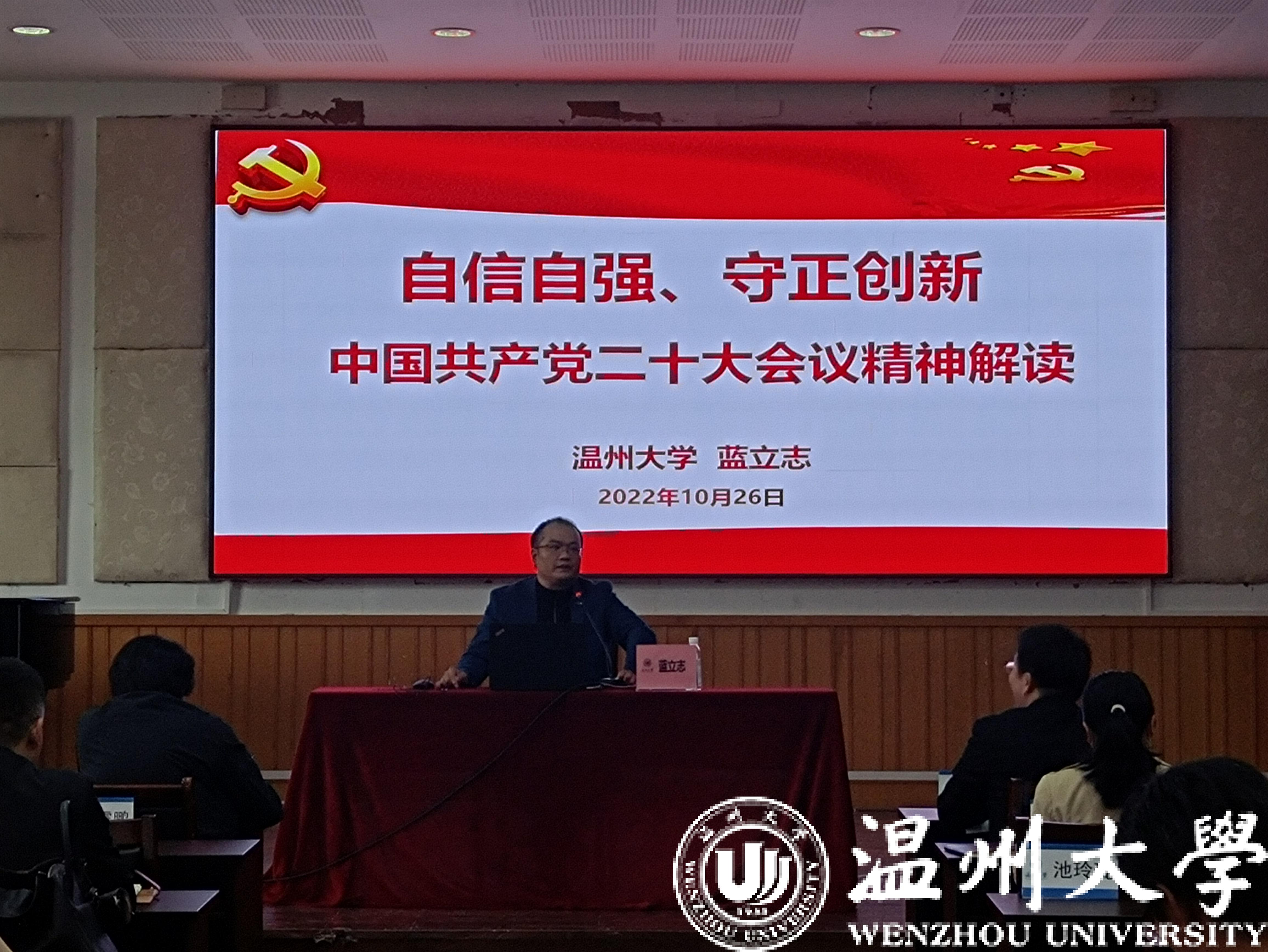 马克思主义学院培训中心主任蓝立志作《自信自强、守正创新——中国共产党二十大报告导学》作专题报告。蓝主任从二十大情况简介、深入学习习近平总书记二十大会议报告、理论创新、伟大意义等四个方面进行了深入的讲解。习近平总书记二十大主题报告共分十五个部分,第一至第三部分是总论,第四至第十五部分是分论。