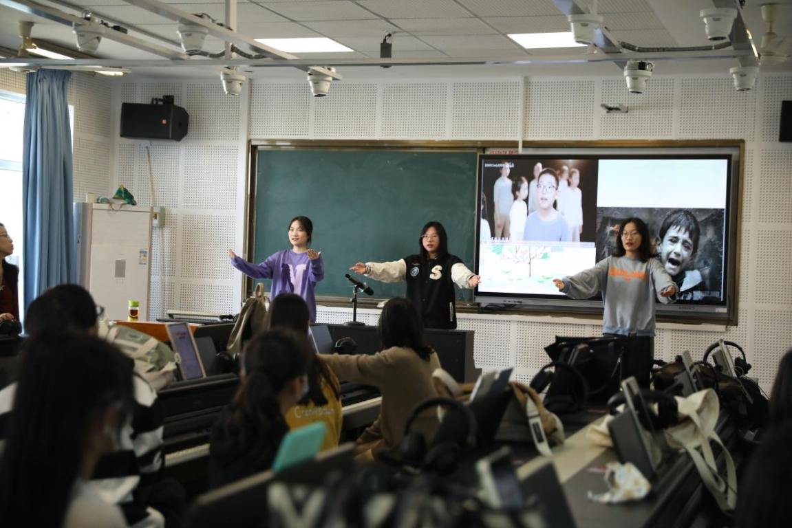 紧接着,严老师针对本节课的节奏进行仔细讲解。讲解后,她从班级中挑选出几位优秀学员带领着整个班级一起来弹唱《让世界充满爱》,让大家更好地理解这首歌,将自己融入这首歌中。她带领孩子们用不同的形式反复练习。在学唱新歌的时候,同学们容易出现节奏不准确的情况。针对这一现象,严伊娴老师用对比演唱的方式,及时纠正学生出现的错误。最后,伴随着欢快的歌声,老师和同学们来了一场集体表演,愉快地结束了本堂课的教学。