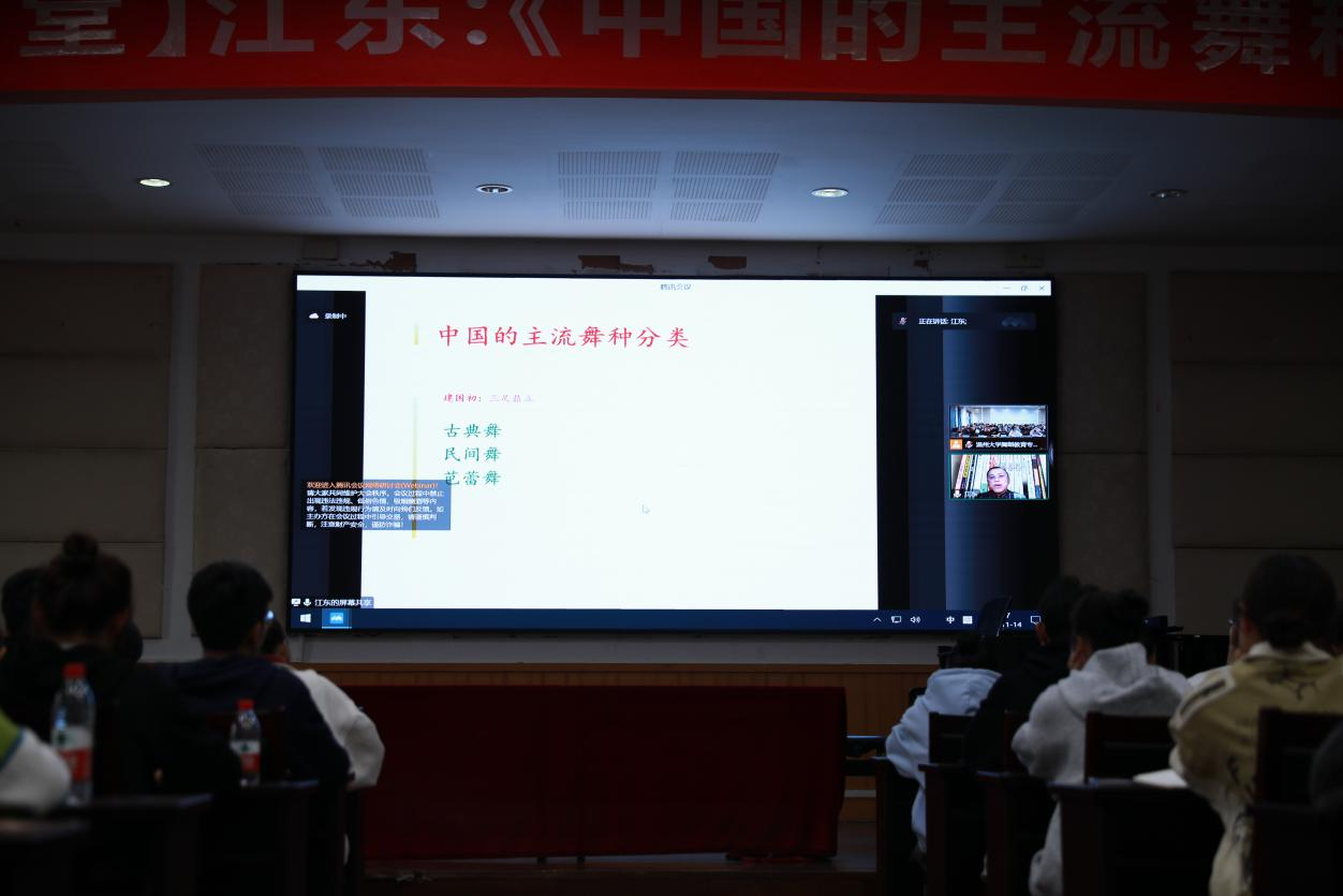 江东老师以戴爱莲和贾作光两位老师为切入点,讲述了近现代中国民族民间舞的发展,列举具有代表性的民族民间舞蹈家杨丽萍、崔美善、阿依吐拉、莫德格玛等进行了详细地介绍,阐述了民族民间舞蹈的缘起,以及不同地区的民族民间舞蹈的独特文化内涵。讲座的最后,以《红色娘子军》《白毛女》《中国妈妈》等具有典型性和代表性的优秀舞蹈作品为例,分析芭蕾舞、现当代舞蹈的缘起与现状。