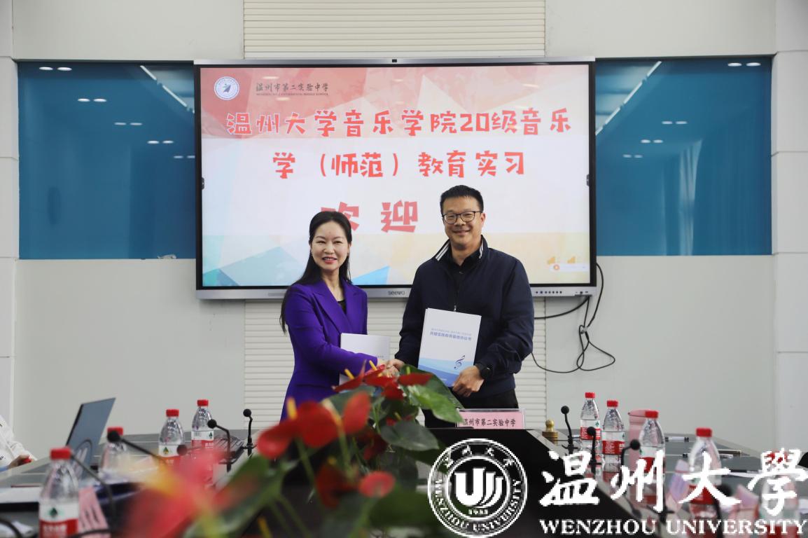 师生的到来表示热烈的欢迎,潘智敏校长致欢迎词潘校长介绍学校的发展史和“润泽教育,向美而行”的教育理念,希望实习学生借助实习契机,为温二实乃至温州的音乐教育添砖加瓦。教务处冯超伟主任介绍了班主任和音乐指导师。