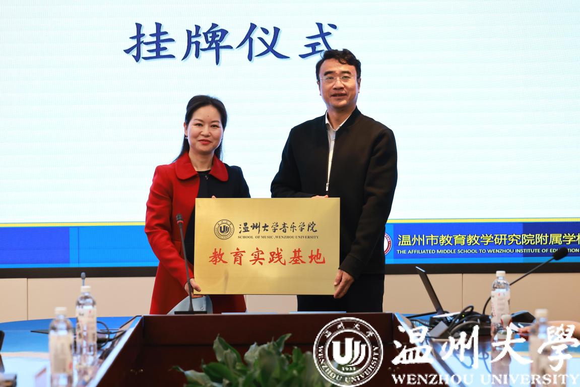 师生的到来表示热烈的欢迎,介绍了学校的基本情况和特色,他希望实习学生做好课前准备,正向引导学生,为学校艺术节等活动发挥自己的才智。瓯海区外国语学校李律副校长寄语实习生,希望同学们通过实习提升教学能力、发挥特长,最后双方进行了揭牌仪式。
