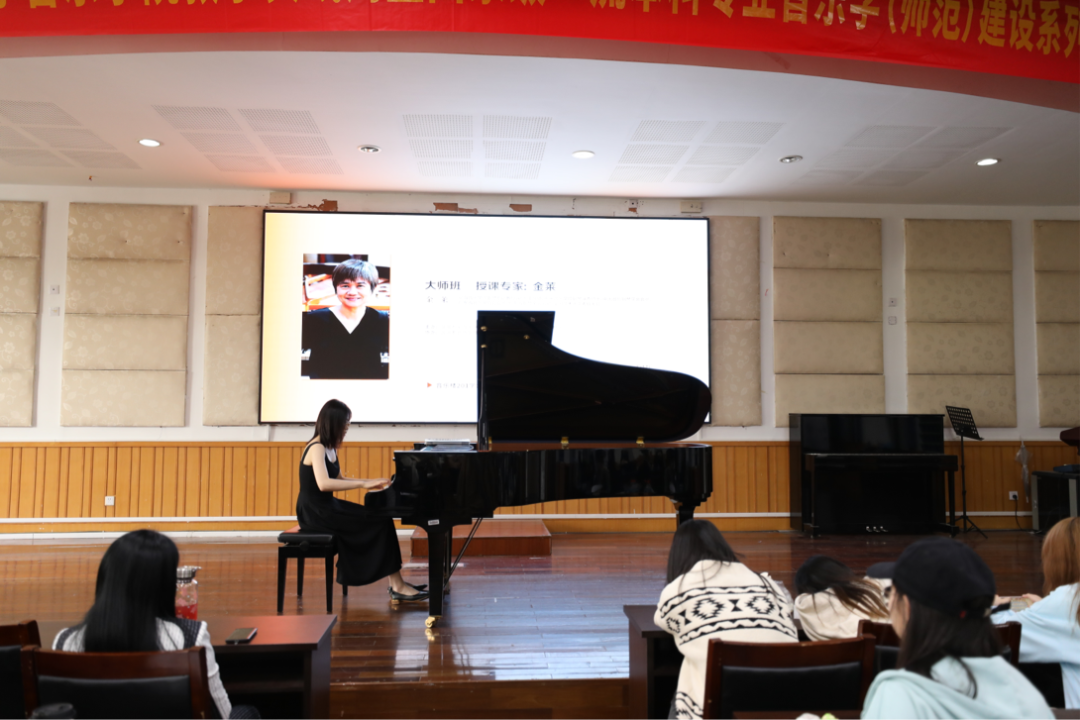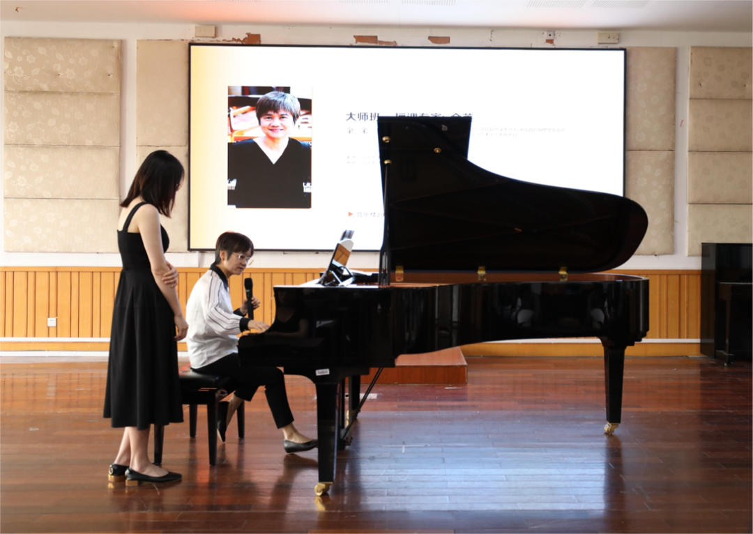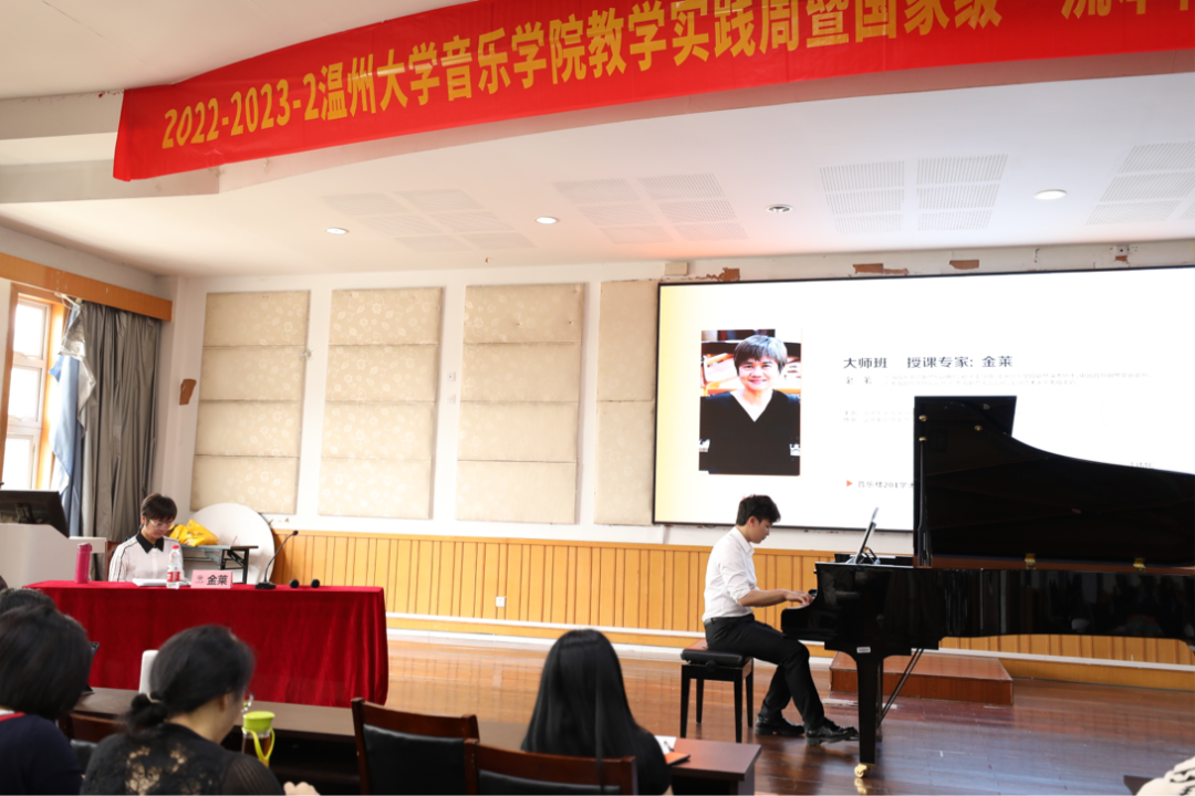 钢琴演奏硕士、中国音协钢琴学会会员、广东省音乐家协会会员、广东省钢琴学会会员、全国艺术水平考级考官——金莱教授的大师课。本场大师课中,教授分别为我校3名不同年级段的学生进行了一对一的钢琴演奏指导。