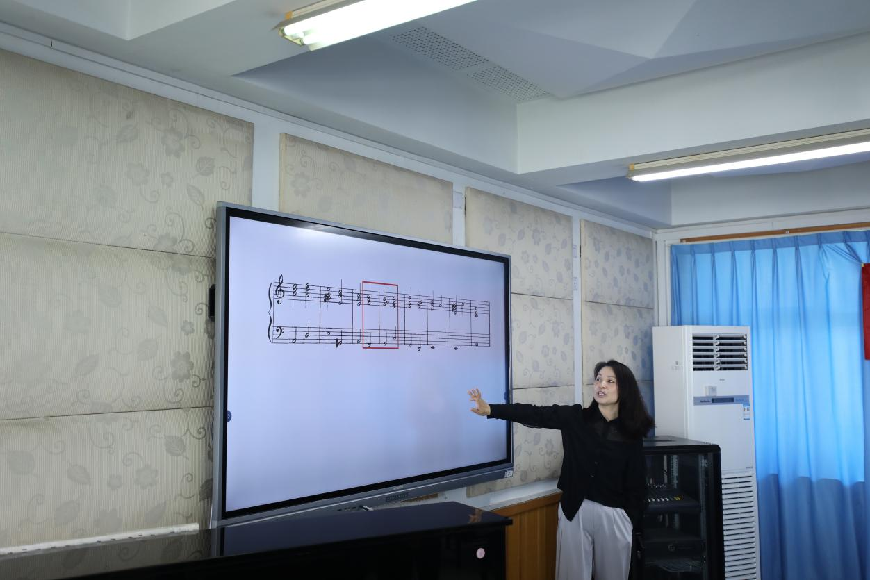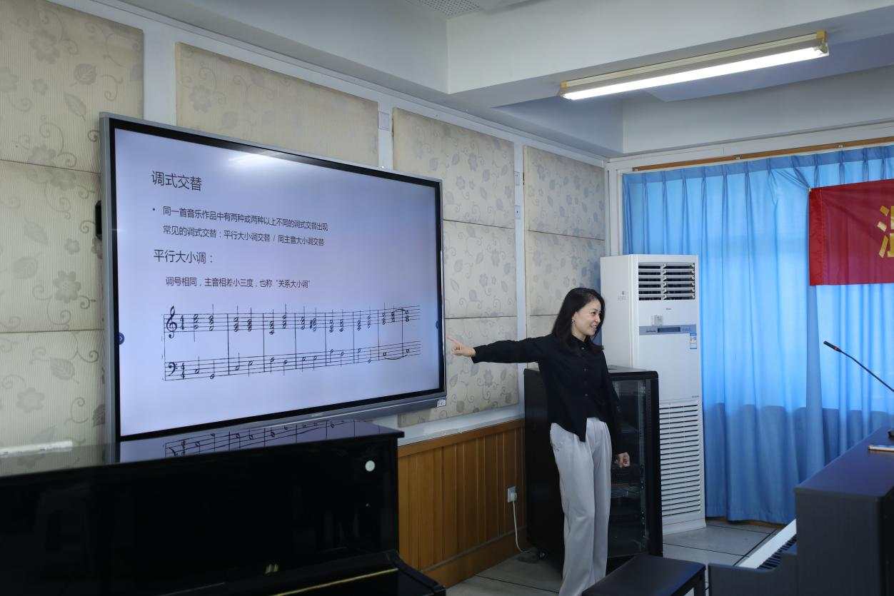 首先,陈颖老师由一首流行歌曲展示了和声的语言魅力。通过对谱例调式调性的分析,将本节课的平行大小调交替时和声音色与色彩的变化杂糅其中,让课堂生动有趣。随后,陈颖老师通过《贝加尔湖畔》这首出现在小学六年级教材的歌,为大家讲解了可以根据不同的旋律,情绪使用分解和弦以及半分解和弦进行即兴伴奏。课堂最后,陈颖老师再次播放开头的那首歌,从听觉感受让学生再次体会和声语言的运用,进行更加深层次的思考。“比金钱更珍贵的是知识,比知识更珍贵的是永无止境的好奇心。”陈颖老师希望在日后的学习中,同学们继续保持对调式分析的好奇心,持续对音乐的这份热爱!
