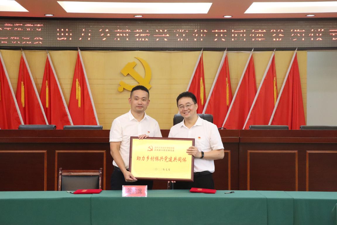 和永嘉县、大若岩镇等领导和实践队代表的共同见证之下,党委书记朱启鑫与永嘉县大若岩镇党委书记张克共同签约助力乡村振兴党建共同体协议书并进行了基地授牌。