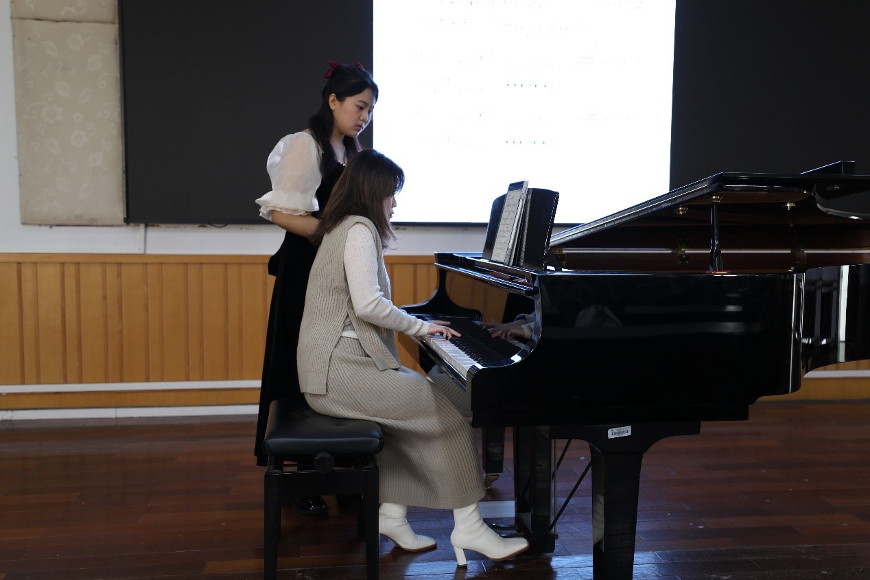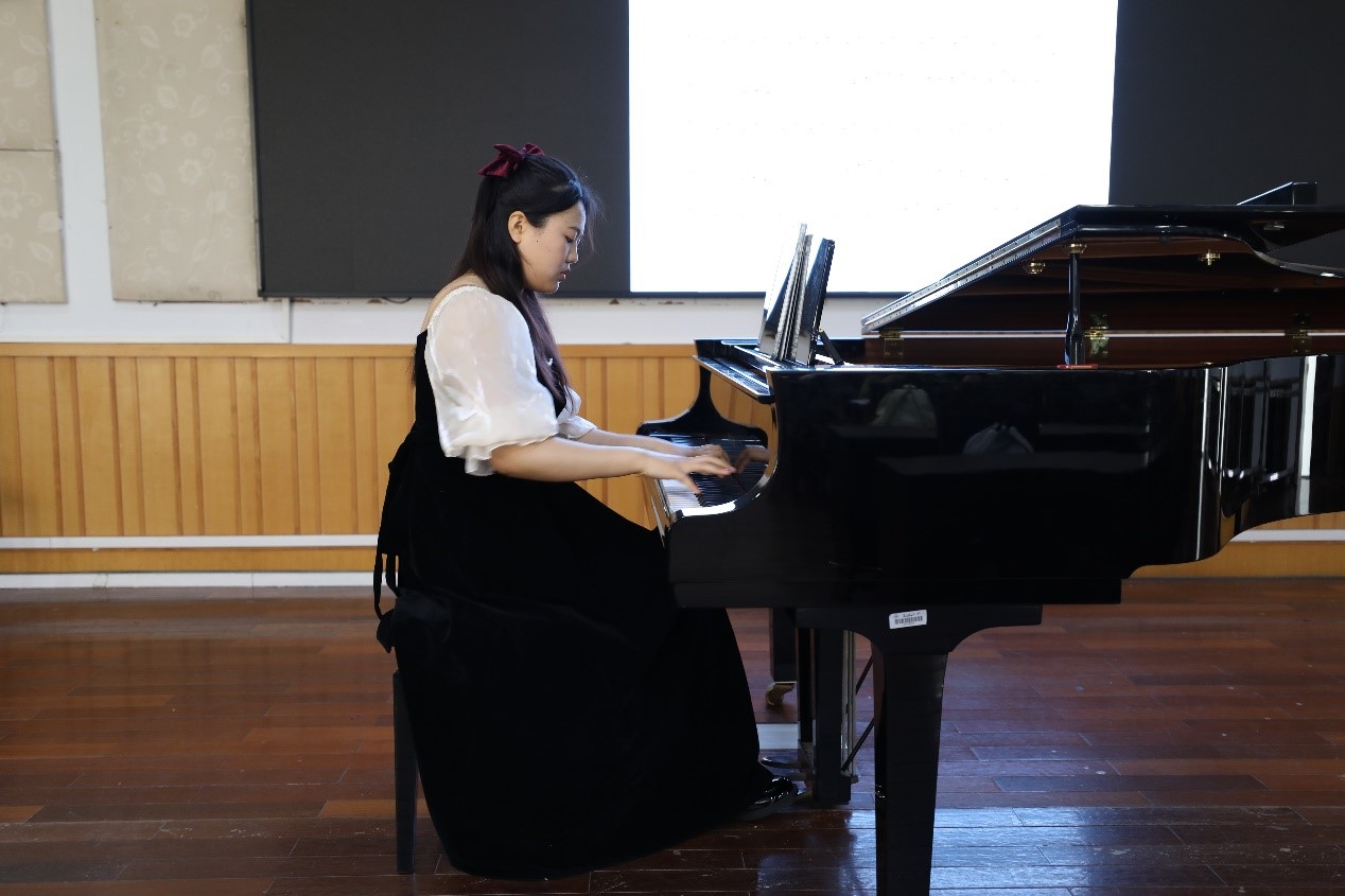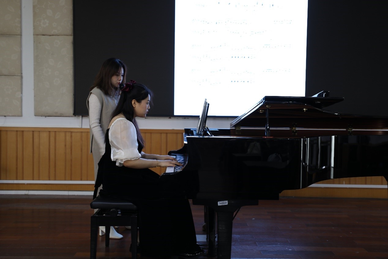 接着,由大一学生赵紫宇上台弹奏。在演奏结束后,然后由王启颖老师对刚才的演奏提出了一些需要改进的地方:比如开头部分给人的感觉应当是朦胧遥远的,如同回忆一般的,是一种非常美好的感觉,因此第六小节的保持音应当强调,稍微拉长一些;再比如在开始演奏之前,应当先想好自己想要什么音色,音乐所呈现的应该是什么色彩……接着由王启颖老师进行了示范演奏,在这之后,王启颖老师利用翻转课堂的模式,再次细化刚才所演示教学的内容, 这不仅让台上同学对这首乐曲有了更深的感悟,也让台下的大家更够更深入地体会到钢琴的魅力。