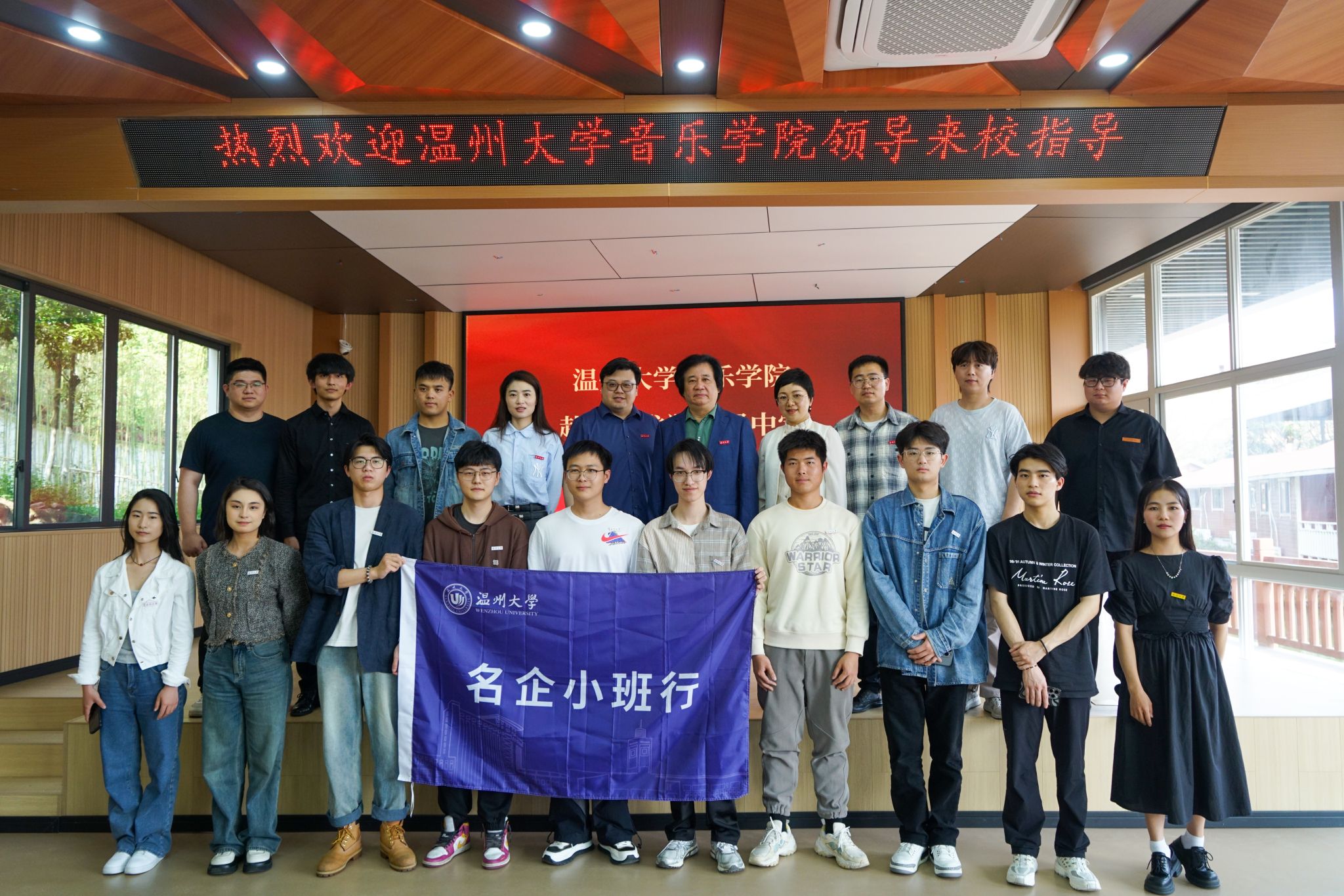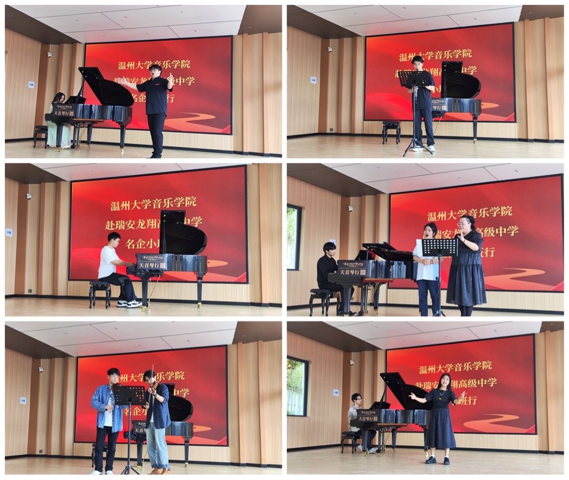 在瑞安龙翔高级中学董事长陈伟、校长杨文发、副校长林昌明等领导热情陪同下,我院师生一行首先参观校园,在学校新落成的文化艺术中心和琴房前,毕业生们驻足观看,饶有兴致的了解学校对艺术类学生培养的特色和对教师招聘各项政策。随后,领导和师生走进音乐厅,观摩了一场音乐特色班示范课,龙翔高中音乐教师高水平的教学技能给我院毕业生留下了深刻的印象。示范课结束,我院毕业生代表依次上台献艺献唱,与龙翔高中的音乐教师们共同开展了一场小型音乐会,交流艺术技能同时,将才华与特长向学校领导充分展示。瑞安瑞安龙翔高中副校长林昌明对我校毕业生给予了充分肯定,对他们现场展现出来的高水平专业技能给予高度评价。