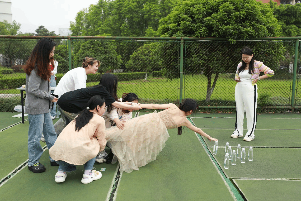 的同学们积极参与,热情高涨;在“蛟龙取水”游戏中,参与者分组合作,通过巧妙运用力量和智慧,相互成长,共同扶持; 看不远处“旋转陀螺”的参赛者们晕头转向,笑容满满;紧接着在“你演我猜”游戏环节的过程紧张而有趣,每当猜对一个词语时,都会引起全场的雀跃欢呼!