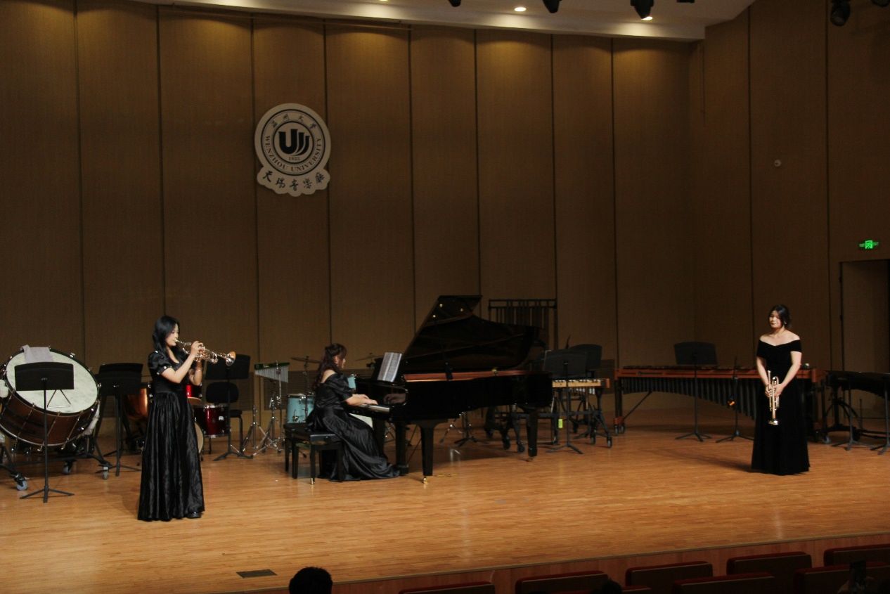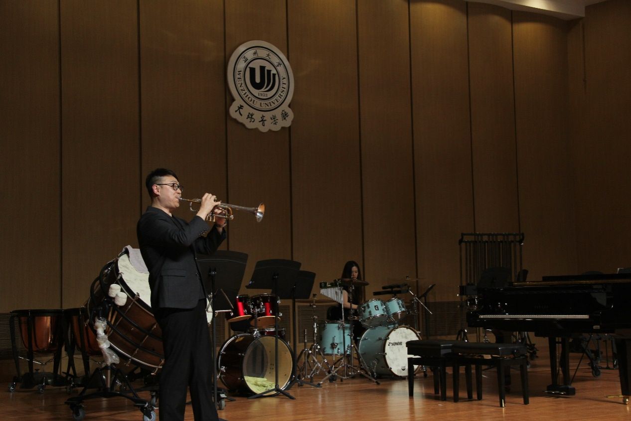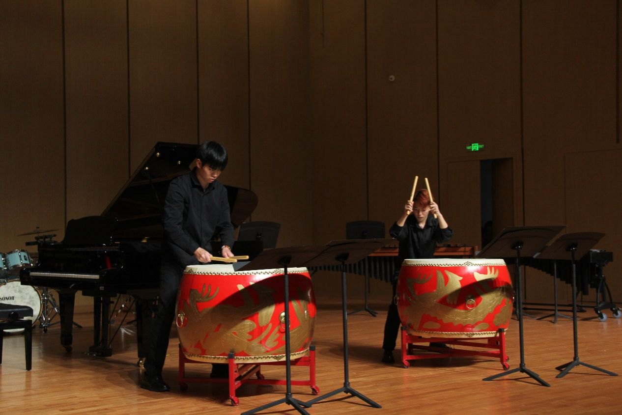 接着是由郑雨同学携钢伴唐声荣同学带来的长号演奏《查尔达什》,这首曲目是由小提琴改编而来,很好地为我们展现了乐器跨界演奏风格。随后尤泽博和朱文静演奏的《牛斗虎重奏》让人印象深刻,给人带来了很强的震撼。紧接着第四第五曲分别是《秋叶》和《伦敦德里小调》,演奏完毕,卢梦滢老师携崔议文、朱文静、朱丽娜等学生带来的《科技先锋》,各种形态的乐器相互配合,相互合作,构成了一个和谐的音乐情景。《节奏之旅》为我们展现了肢体打击乐的表演形式。