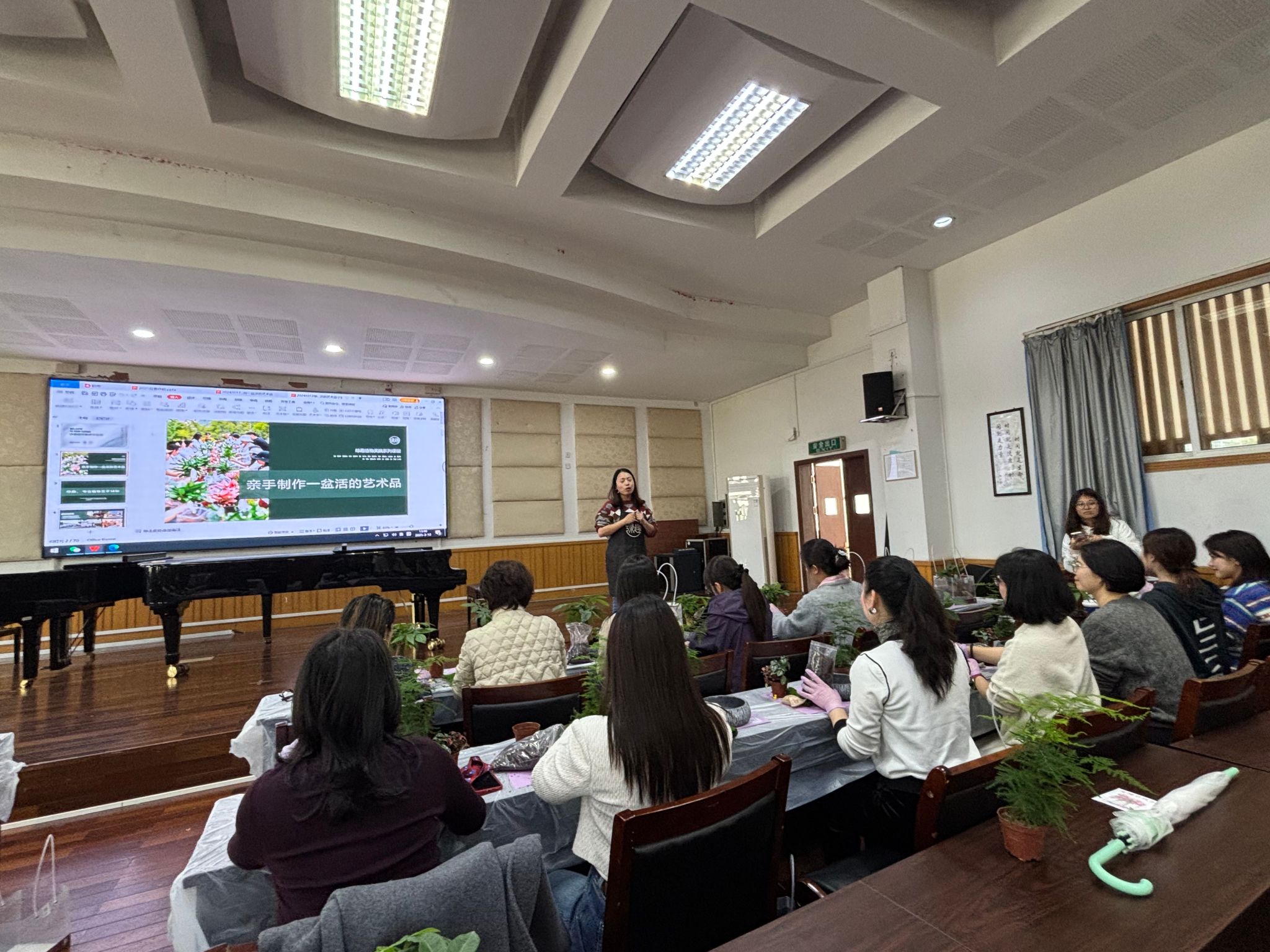 活动现场,园艺师为大家详细讲解了盆栽种植的基本技巧和养护方法。从土壤选择、植物搭配到浇水施肥,每一个步骤都细致入微。女教职工们认真聆听,积极提问,现场气氛热烈。随后,大家纷纷动手,挑选心仪的花盆和植物,亲手栽种属于自己的“迷你花园”。在种植过程中,大家互相交流经验,分享生活中的绿色小妙招。一盆盆充满创意的盆栽作品逐渐成型,展现了女教职工们的巧手匠心和对生活的热爱。活动结束后,大家捧着自己亲手种植的盆栽合影留念,脸上洋溢着满足的笑容。