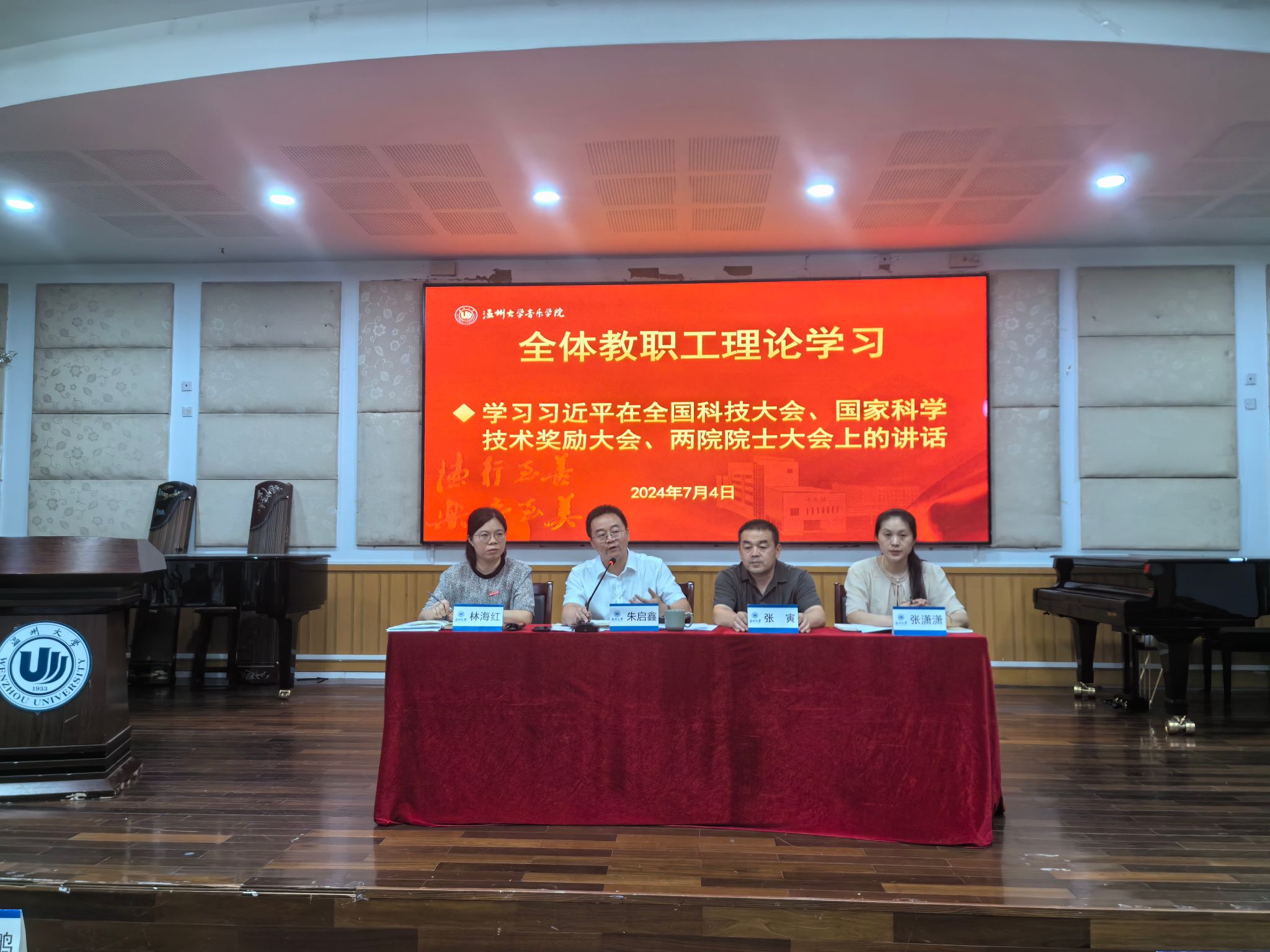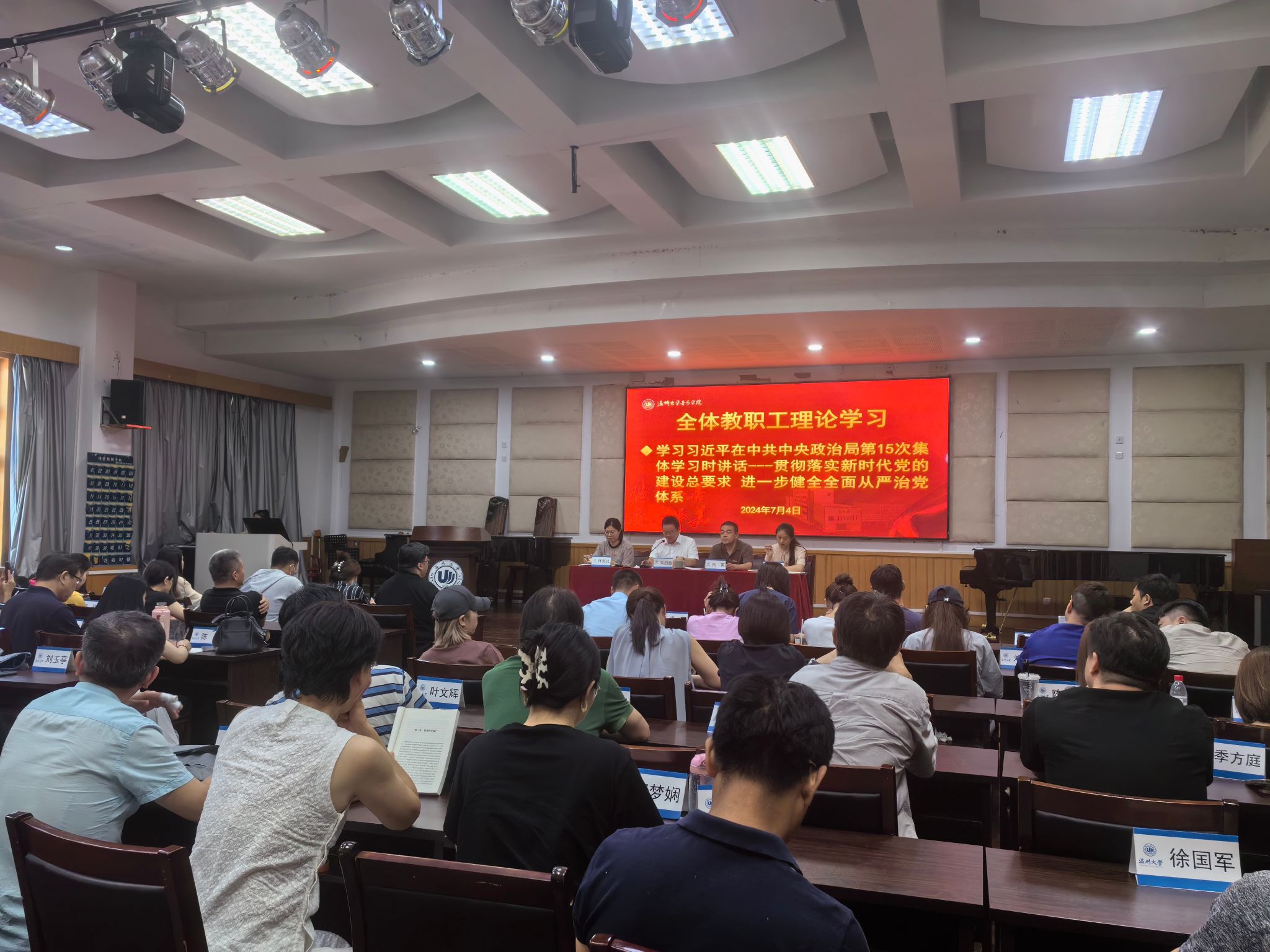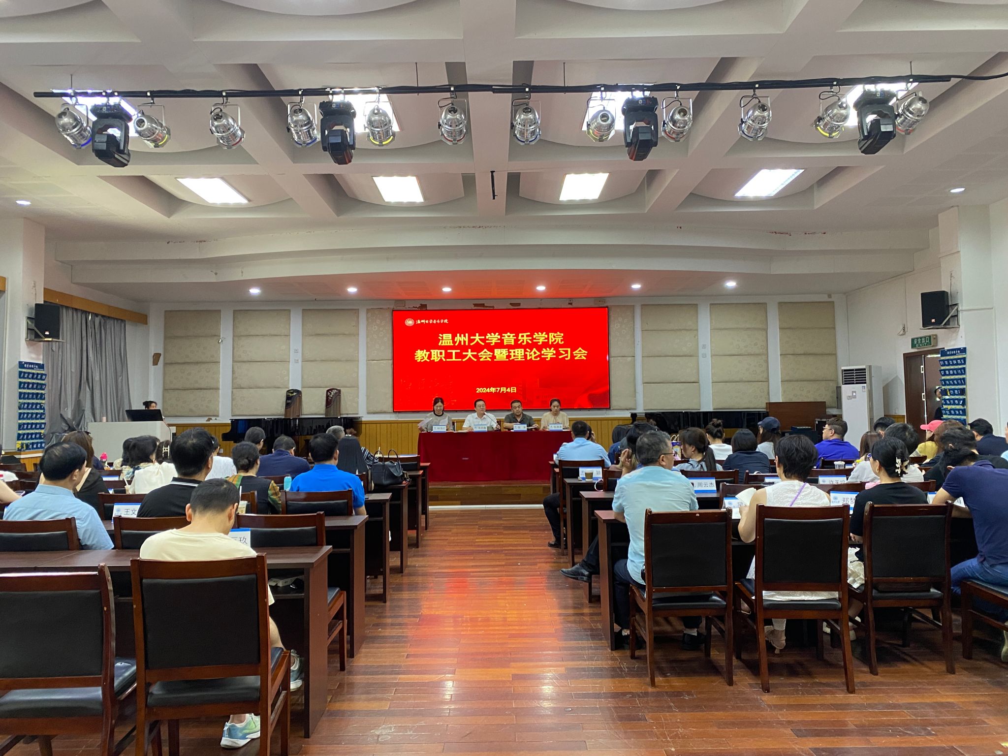 期末全院教职工大会暨理论学习会在音乐楼201室召开,本次会议由院党委书记朱启鑫主持,学院全体教职工参加。