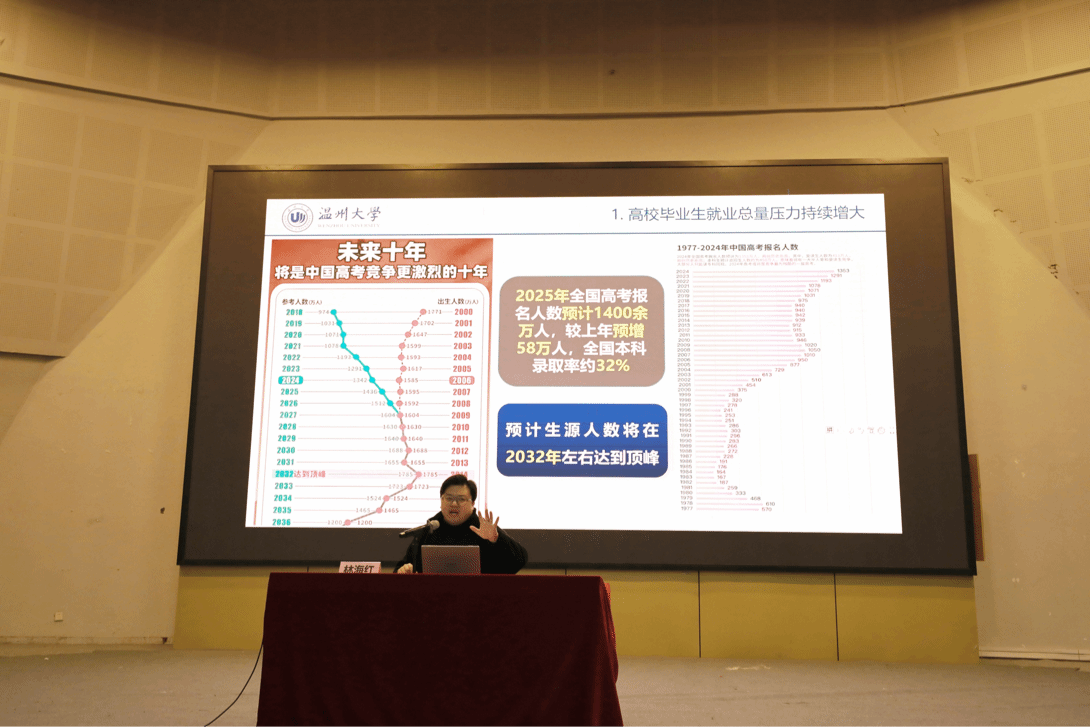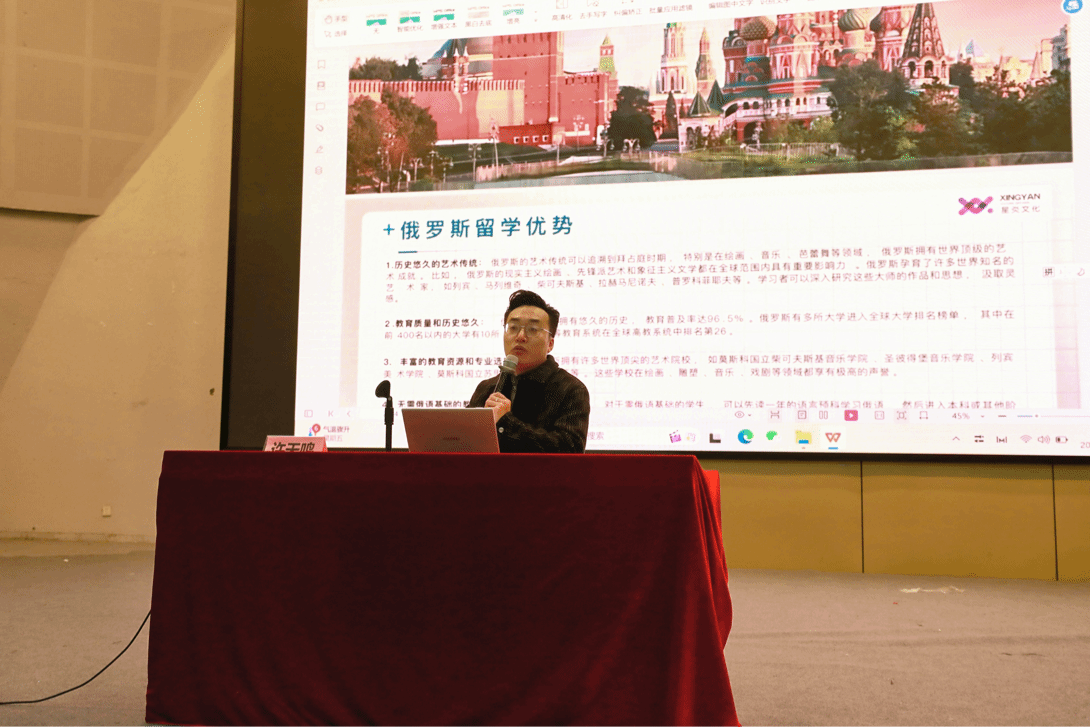 首先,院学工办主任胡震鹏做就业升学、就业政策宣讲,胡震鹏表示,相比激烈竞争的国内就业市场和国内艺术类研究生升学现状,出国留学相对门槛更低,备考压力较小。同时,更优越的教育资源和更先进的教学方法能给艺术类学生的专业提升提供更加高水平的平台。因此,留学可以为未来发展打下坚实基础,使毕业生在就业市场中更具优势。