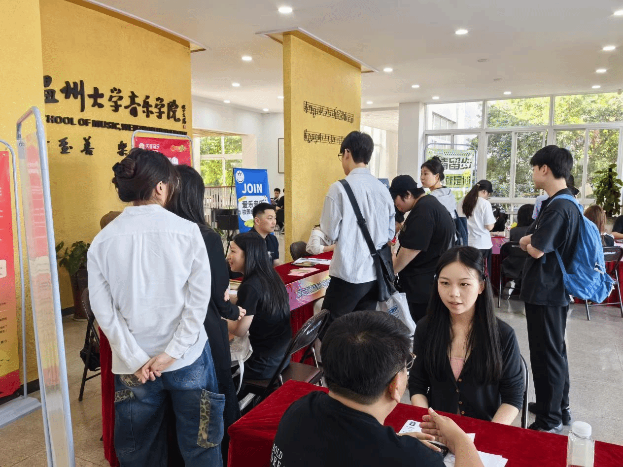 在招聘会现场,毕业生们手持精心准备的简历,积极与用人单位交流沟通。对于他们而言,这场招聘会不仅仅是一次求职机会,更是一场生动的职业生涯规划实践课。在与用人单位的洽谈过程中,毕业生们深入了解音乐市场的需求趋势、对毕业生专业素养要求等行业动态,能够更加明确自身定位,从而为未来的职业发展做出更为合理的规划。招聘会选在毕业生论文答辩当天,实现了“培养+就业”的无缝衔接,让学生们刚走出答辩场,走入面试厅。