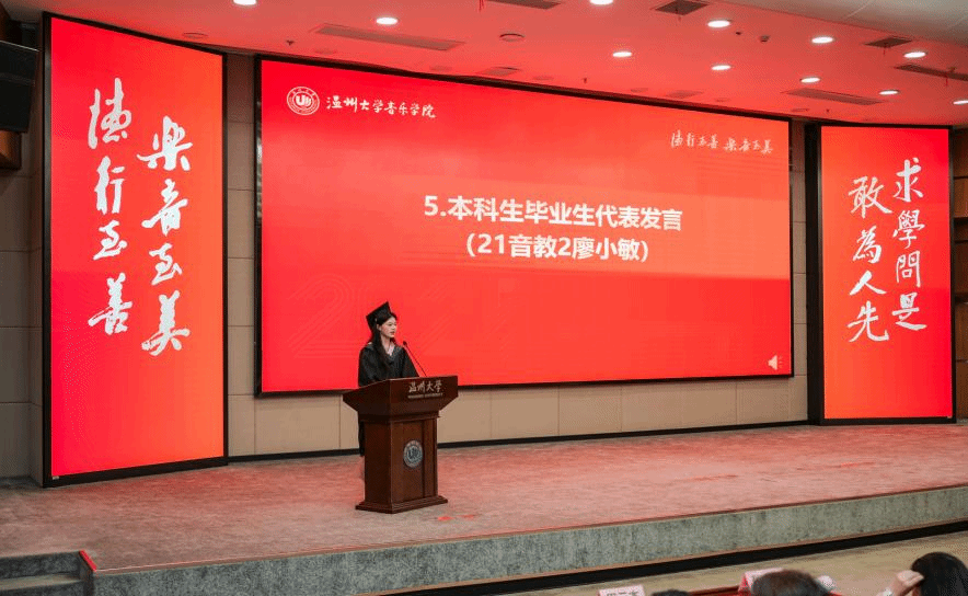 毕业生代表发言,22音研范鑫满怀感激致谢导师们的悉心指导,助其在学术研究少走弯路;提及学院浓厚学术氛围推动自我突破,直言这段经历是人生宝贵财富。21音教2班廖小敏分享自身成长故事,她表示,在温大毒舌电影