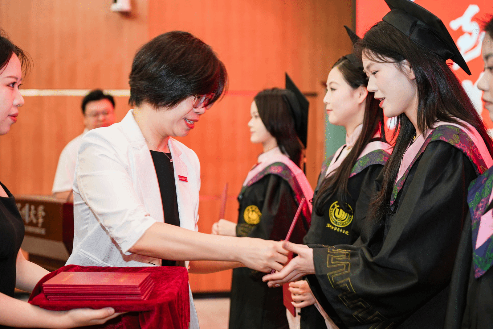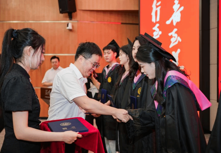 毕业典礼最后,副院长张潇潇宣读学位授予决定。学院学术委员会的教授们逐一为毕业生拨穗、颁发学位证书,并合影留念。这一庄重的仪式,象征着毕业生们圆满完成学业,即将踏上新的征程。