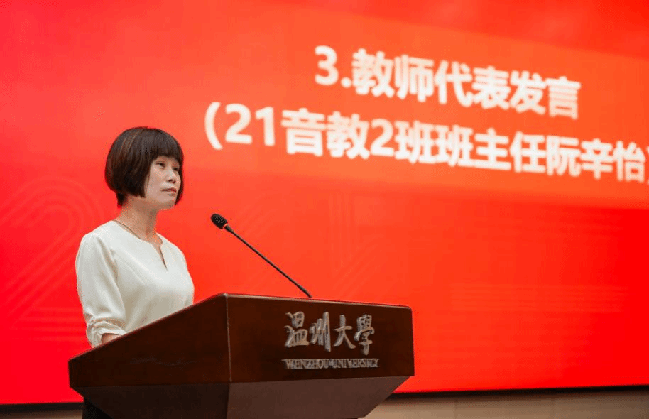 教师代表,21音教2班班主任阮辛怡老师的发言充满温情,她表示看着大家从青涩走向成熟,在音乐教育的道路上不断成长,感到无比欣慰。愿毕业生们永远保持对教育的热爱,用音乐传递美好。