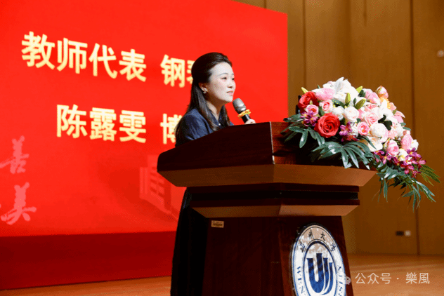 钢琴系青年教师陈露雯博士作为教师代表发言,她用三个音乐术语来分享对大学生活的感悟与期待。第一个术语是:Adagio(慢板)。未来的学习,将是技艺与心性双重的锤炼。第二个术语是:Scherzo(谐谑曲)。大学生活是丰富多彩的,充满了各种可能与挑战。第三个术语是:Allegro Brillante(辉煌的快板)。大学四年,将是同学们青春中最昂扬、最闪亮的篇章。希望每一位学子在未来的时光里,找到属于自己的节奏,演奏属于自己的旋律,书写属于自己的青春乐章。