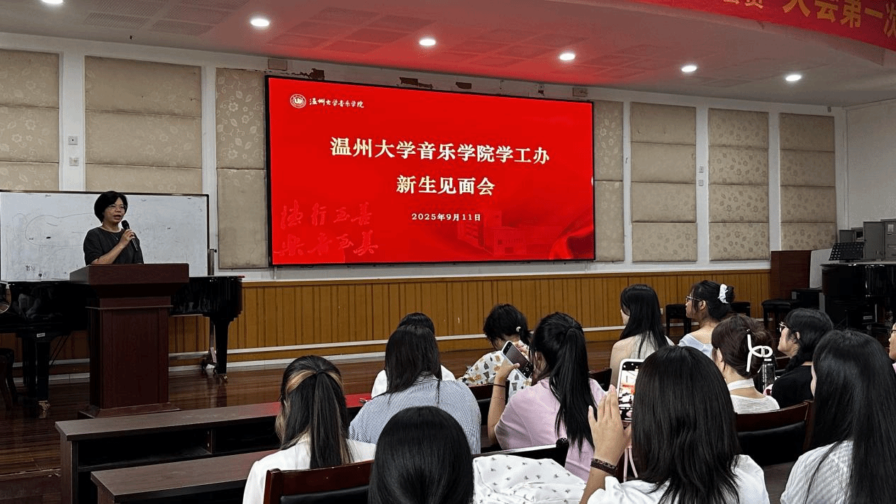 2025级新生学工见面会在音乐楼201学术报告厅举行,150名怀揣梦想的新生齐聚一堂,开启了他们大学生涯的重要一课。院党委副书记林海红,学工办主任胡震鹏,辅导员曹清清、张凯出席见面会,为新生们全方位解读学院学生工作体系,助力他们在求学之路上行稳致远。