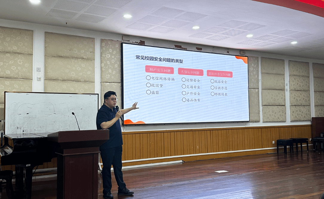 学工办主任胡震鹏首先在学风建设方面向新生做了规范讲解,他强调,艺术的精进始于课堂的专注,成于日常的积累。胡震鹏详细讲解了学院的学风体系,介绍课堂出勤反馈机制,规范请假流程,让新生清楚的了解严谨的学风是艺术创作的基石。安全教育环节中,胡震鹏结合我校典型案例,深入剖析了大学生面临的安全风险。在人身安全方面,重点讲到寝室违规电器带来的安全隐患,新型毒品带来的潜在威胁;财产安全方面,胡震鹏结合电信诈骗、校园贷等典型案例,警示新生要警惕此类安全隐患;意识形态安全方面,提醒新生要坚定马克思主义宗教观,坚守我国宗教法律法规,将安全意识深植于心。随后,胡震鹏向新生介绍几种职业生涯规划路径,他鼓励新生从入学起就树立职业目标,找到适合自己的发展方向。