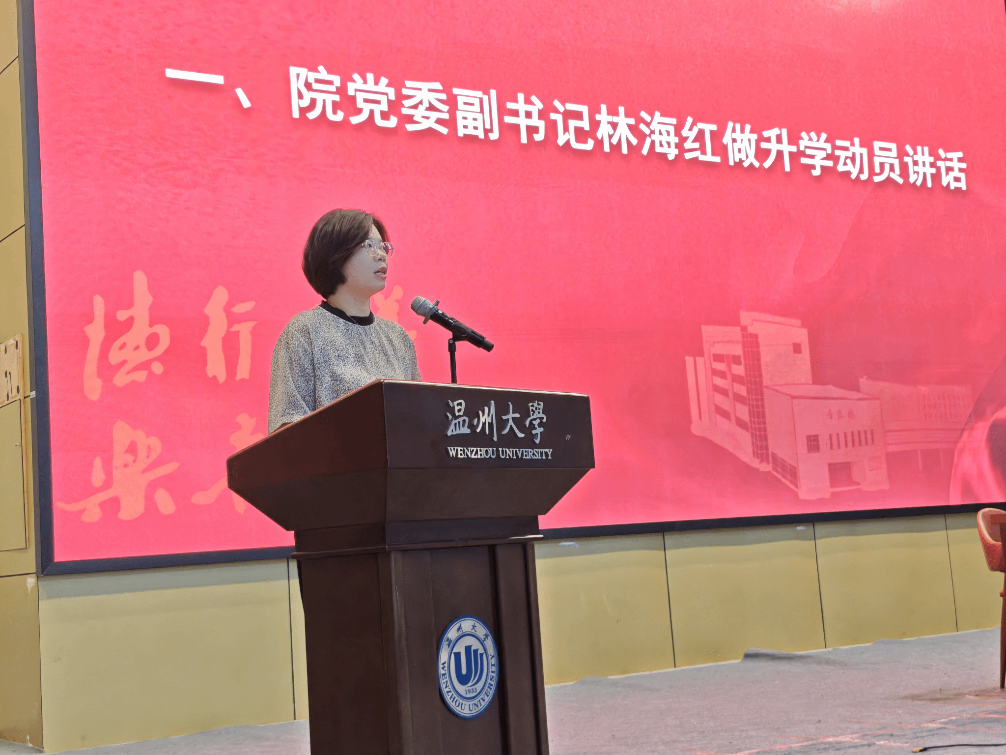 2025年升学(考研、留学)动员大会暨出国留学专题讲座在南校区 9 号楼报告厅成功举办。院党委书记杨振海、党委副书记林海红,全体辅导员出席,大会由院学工办主任胡震鹏主持,大一、大二、大三全体本科学生共同参会。