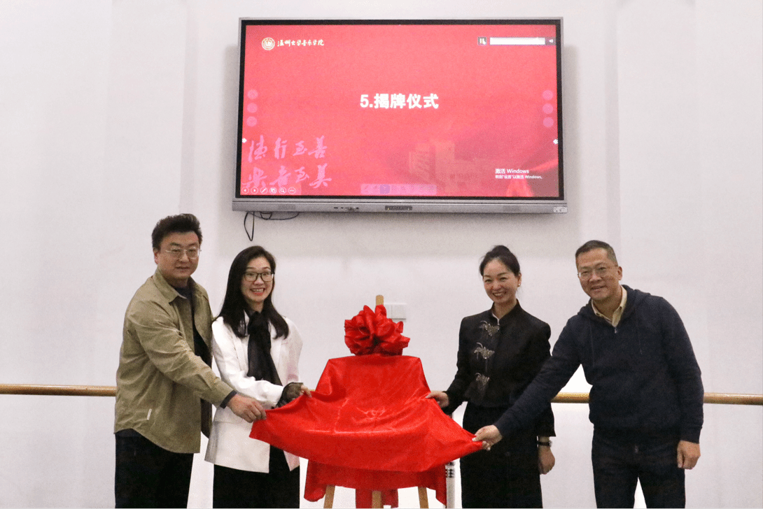 随后,黄雪娇、陈敏校友与学院党委书记杨振海、校友会会长陈波共同为舞蹈房揭牌,标志着这一凝聚关爱的空间正式启用。