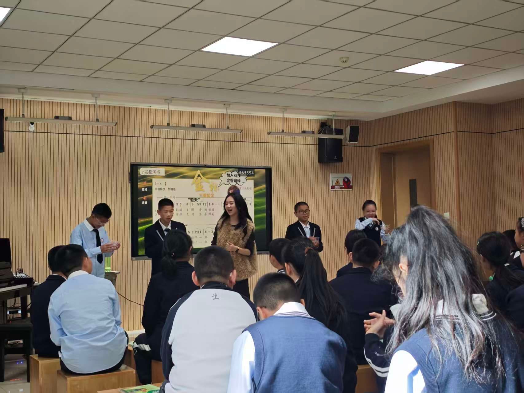 教《阿里郎》时,融入朝鲜长鼓节奏训练,让学生在 “唱打结合” 中感受朝鲜族音乐魅力;教《金杯》时,结合蒙古族酒礼动作模仿,让学生理解 “歌如其文化”;教《映山红》时,关联江西山歌特征与红色历史,让旋律成为红色精神的传递载体。教师们还贴合初中生认知特点,设计分层练习、趣味互动 —— 用 “等腰三角形” 比喻讲解抽象的 “变奏” 概念,用沙锤实操让台湾民谣教学更具趣味性,用通俗的语言拆解装饰音、重音记号等难点,这些巧妙的教学设计,让同学们真切看到优秀音乐课堂 “化繁为简、以生为本” 的核心要义。