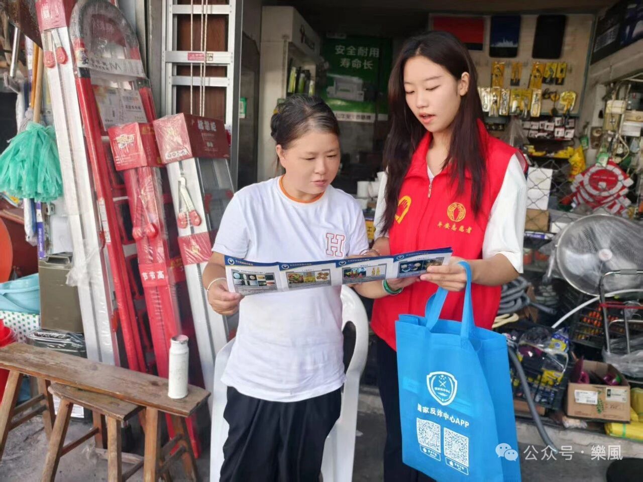 社区活动中心的小广场上,红色的"艺启来反诈"横幅在树荫下格外醒目。几张蓝色折叠桌拼在一起,铺着印着"防范电信诈骗,守护财产安全"的桌布,上面堆着厚厚的传单和手册﹣﹣封面上印着卡通警察形象,配着"陌生来电要警惕,核实清楚再相信"的标语。