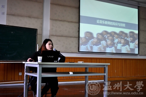 首先,黄若芙向在座的学生阐述了舞台演艺基本能力的重要性:“一个好的音乐教师也是一个好的演员”,需要良好的表现能力,让孩子在学中玩、在玩中学。考编时的试课应适当体现出自己的专业特长,让考官看到你的长处。其次,黄若芙介绍了课堂教学的基本能力,如位置技能,上课不要局限讲台;板书技能,不局限文字,能突出重点及思路;语言技能,吐字清楚,语速适中;手势技能,不用单指,能起强调作用;提问技能,让学生与老师良好互动。接着,黄若芙又建议学弟学妹们要有创新能力,可以在传统的“教一句唱一句”的教学上改变,如运用柯尔文的音高手势、奥尔夫节奏等。对于即兴讲演,黄若芙也有自己的经验,她建议在座的学生可以每天背一两句关于音乐教育类的名人名言,思考分析了即兴讲演中可能会出现的问题。黄若芙还讲到分析案例不能以偏概全,需角度多方面,由表渐里,由浅入深,运用切实的例子,虚实结合,更具说服力。最后,黄若芙介绍了模拟上课,表示“人类最强的能力就是模仿”,在作为一个老师初次上课之前,可以去听课,汲取不同老师的讲课优点,并在微格上课时用视频记录下来,发现自己的不足之处。另外,老师在备课时可选择不同类型的歌曲,如童谣,民歌,儿童歌曲……设定不同的上课模板。