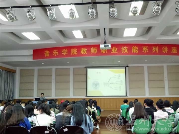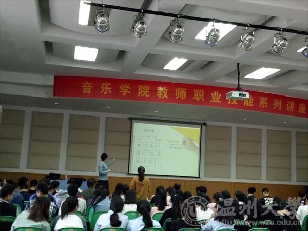 接着便进入了主题,钱老师介绍了说课和试课的概念与优点。然后钱老师以《钟声》和《美丽的黄昏》作为案例,进行了哼唱,随后便邀请三位同学分别对三个教材进行朗读和分析。老师对三位同学进行了指导,告诉他们要用生动、有趣、吸引人的声音去教学生,学会抓住学生的耳朵。大家在愉快轻松的氛围下以舒适集中的状态吸收着钱老师讲授的知识。钱老师还对《大雁湖》这首作品进行了视唱,要求同学们要学会拿到一个陌生的谱子就要会演唱和演奏,告诉同学们要让自己的学生得到知识与技能,要能体会到作品的情感态度价值观。最后以《大鹿》、《田野在召唤》、《舒伯特艺术歌曲》等作品为板书案例结束了今天的讲座。