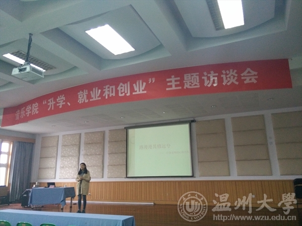 缪芸为我院14级毕业生,现任教于温州市第二十三中学。首先缪老师以音乐师范专业毕业生的身份,对两年来的求职和工作的经历及感想做了总结,并对本科所在班级学生的就业情况做了详细调查,根据调查结果对现今的音乐类本科毕业生的就业形势做了较全面的分析;接着,缪老师就自己本科四年的学习生活经验为例,使同学们明确了自己的学习目标;最后,她从学习、生活两大方面将本科学习阶段的时间划分开来,建议同学们要充分利用时间,使学习效率最大化,尽可能提高自己的专业素养,为自己积累更多的经验,以充足的准备和信心从容迎接即将面临的严峻就业形势。(教务科供稿)