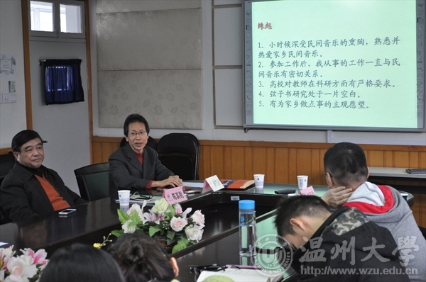 接着讲演的是乔志亮教授,乔志亮教授以弦子书研究为例,探讨了曲艺研究的理论与实践。乔教授从与弦子书结缘开始,回顾了他对弦子书的研究历程。乔教授以弦子书为例,对它进行分析并实践考证,讲述了自己研究中的一些经历及结果。乔教授至现在也有不小的成就,获得过多种奖项,并对弦子书有长达十多年的研究与兴趣。这对在座的研究生起到了一种激励作用,表率作用。能够深刻地了解到音乐,就去爱上它、探索它、挖掘它、坚持不懈地研究它。