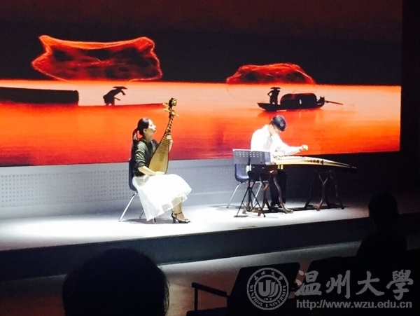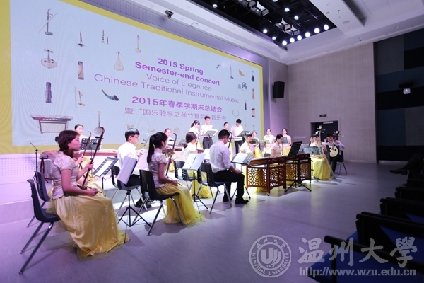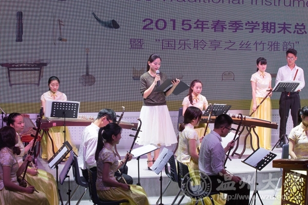 校门,在温州肯恩大学演出的现场,本次“国乐聆享之丝竹雅韵音乐会”由我院董凌凡副教授主持,通过讲解与演奏,生动有效地为现场的观众普及了民乐知识,感受国乐的非凡魅力。音乐会现场会特意配备同传翻译,让在温州肯恩大学的外籍教职员工也能走近国乐、享受国乐。本次音乐公开课堂在阵阵掌声中取得圆满成功!
