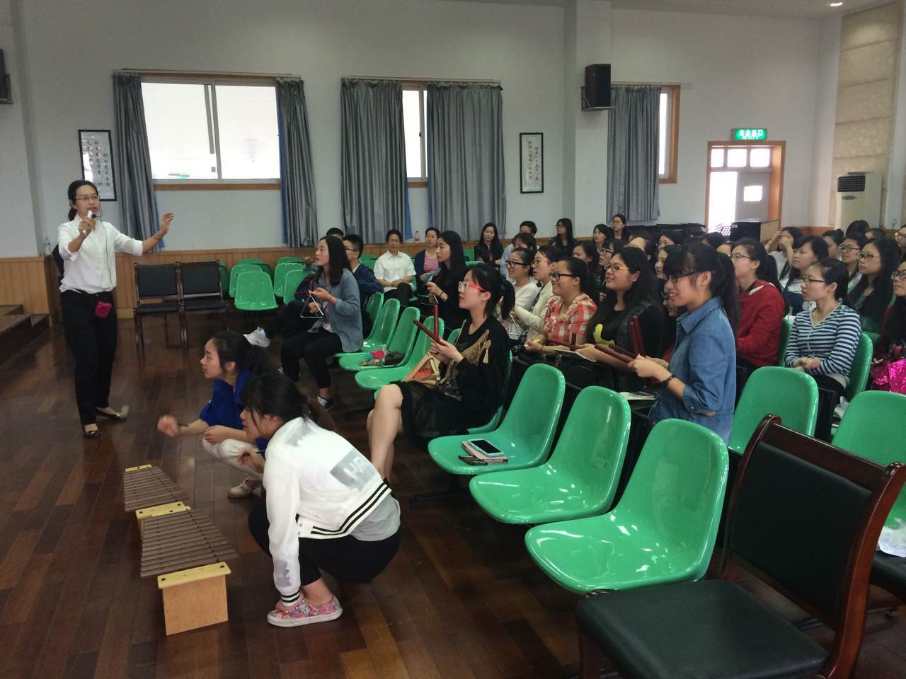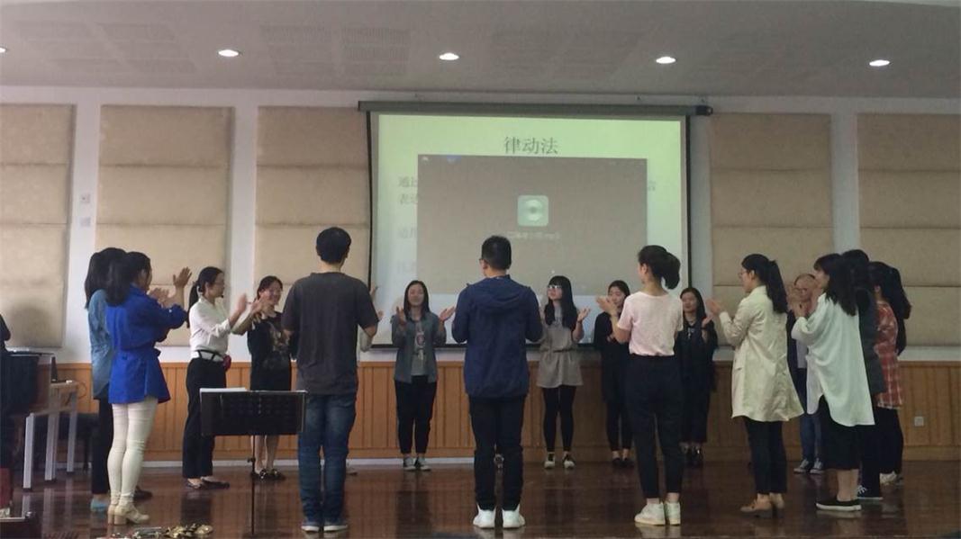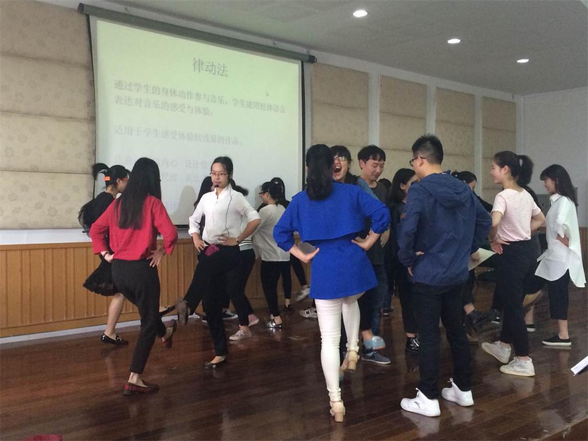李葳老师今天讲的内容是欣赏教学方法探讨,首先,老师向同学们介绍了音乐欣赏的概念。音乐欣赏是以具体的音乐作品为对象,以欣赏者的聆听为主要手段,以阅读分析乐谱,有关音乐材料及认识作曲家所处的历史背景、社会背景为辅助手段,进而达到领悟音乐的真谛、得到精神上的愉悦、实现音乐审美目标的一种实践活动。音乐鉴赏分三个层次:知觉性欣赏、情感性欣赏、理智性欣赏。接着,老师又介绍了音乐欣赏教学的一般过程:1.导入欣赏,目的是激发学生的学习兴趣,集中学生的注意力,但是导入欣赏所占的时间不宜过长。2.整体初步领略环节(初听)目的是使学生对作品有个初步的完整的印象。3.分析性研究环节(重点或分段听)。4.综合性深入体验等。接着又向我们介绍了她自己总结的音乐欣赏课中的常用的方法:讲述法、观摩法、律动法、熟悉主题法、图谱辅助法、乐器伴奏法、为音乐填词法、对比法、调整乐谱顺序法、模拟乐器演奏法、迁移表现法、发现法、探究法、创造法、讨论法、启发联想法等,课堂上,老师也重点介绍了几种方法。首先介绍的是讲述法:通过讲述故事或者与作品相关的事件,让学生对音乐形象有更清晰的认识和了解。此方法适用于有具体音乐情节或者音乐形象比较具象的作品。接着介绍了观摩法:通过老师的直接表演或者欣赏音响、视频,学生对音乐有直观的感受和体验。适用于表现与教师本身专业相关的内容,视频画面清晰,音频质量较佳。最后介绍了律动法:通过学生的身体动作参与音乐,学生能用肢体语言表达对音乐的感受与体验,适用于学生感受体验较浅显的作品。然后请同学上台体验了这个方法,先是老师教一个音乐,让大家体验一下,同一首音乐也可以用不同的律动方法,然后放另一首音乐让同学们自己想动作,同学们积极响应,也做的非常好。除了自身的动作,还可以配乐器来掌握声部规律等。