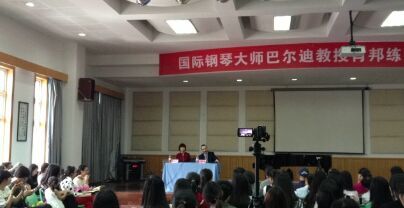 客座教授”的聘书,掌声热烈。本次专题讲座的翻译由阮辛怡老师担任,她首先为大家简要介绍了一下巴尔迪教授的荣誉与经历,包括曾于第六届艺术周期间邀来的中国优秀钢琴家陈韵劼老师就是师承巴尔迪教授。