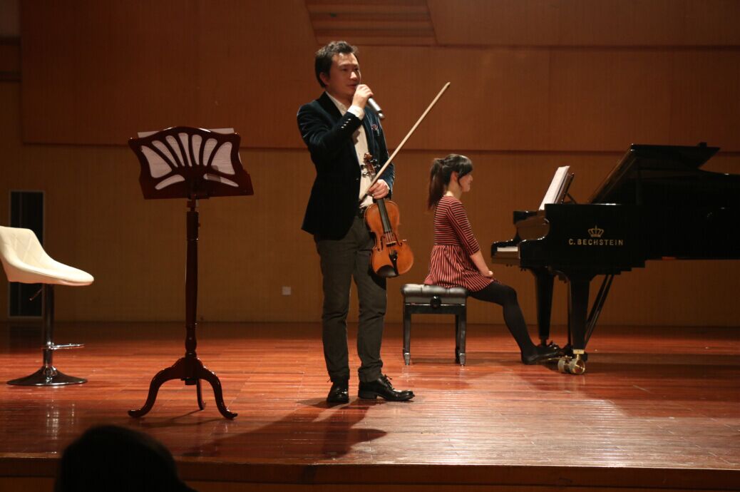 刘玉亭老师,他以幽默的主持方式带动了听众的热情与兴趣,并为听众带来了一首安徽民歌,博得了阵阵掌声。紧接着胡锦超老师粉墨登场,他身着西装,为我们讲解了电影音乐的起源,在默片时代电影音乐已经出现,用已有的音乐或即兴创作,在电影放映时由交响乐团或室内管弦乐队当场演奏,在一些偏远地区,将弦乐总谱简化成钢琴谱,由钢琴乐手弹奏。这种现场演奏的音乐依赖与演奏者与乐团的临场反应,演奏的时值几乎与影片长短相同,但常常音乐情绪与画面毫不相干,后来各位音乐家开始给电影进行配乐,此后不到三年,有声电影便席卷整个影坛,成为主流,1934年奥斯卡奖增加了最佳音乐奖的颁发,对电影音乐产生了正面积极的效应。由此胡锦超老师引出了第一个节目《天堂电影院》,他请出了他的夫人与他进行小提琴钢琴合奏,音乐把我们带入到意大利南部小镇姜卡尔多,主人公多多从乡村到城市打拼最后又回到城市,他打开老艾费多留给他的礼物:一盘电影胶片,当初被删去的接吻镜头都被接在一起。当初小多多曾经那样百般企求而不得的胶片,现在老艾费多一并送给了他,连同一些令人缅怀的记忆、一些流逝的岁月与梦想、以及那个已经过去的曾经带给人们天堂般幸福感受的电影的时代。 一曲结束,掌声雷动。