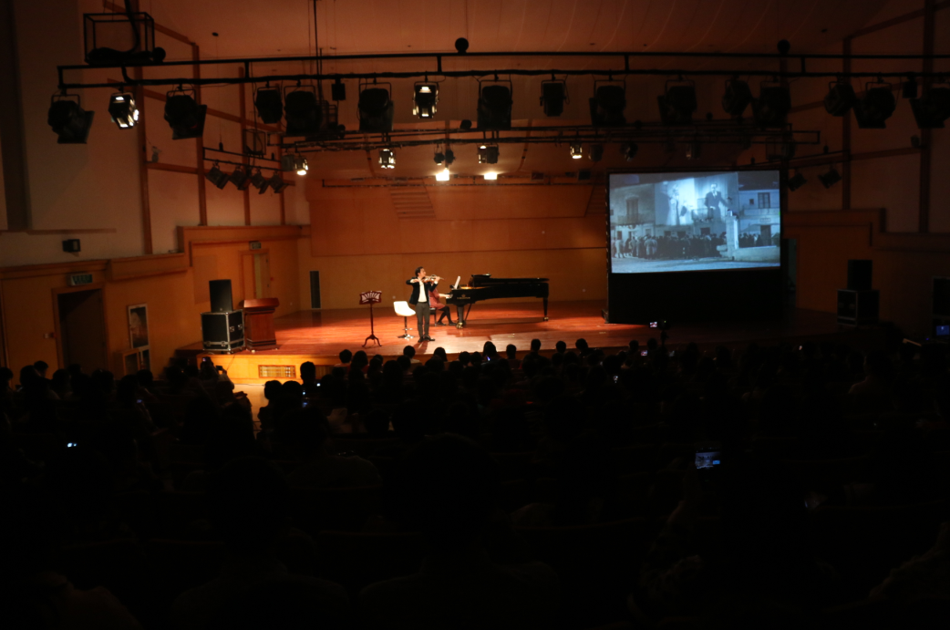 大一学生孔逸蕴带来的吉他弹奏,他弹奏了电影《断背山》的背景音乐。不同的乐器演奏为音乐会带来新的元素,也改变往日平时大家对音乐的理解。紧接着,胡老师为我们带来电影《闻香识女人》中的音乐,这首Tango风格的曲子,曲式为ABAB,首段呈现慵懒幽默的口吻,进入到B段转小调,转而呈现激情的感觉,接着又转回大调。由小提琴和口琴作对位和声的表现。两个部分那种前后矛盾而又错落有致的风格充分的展现了探戈舞中两人配合的默契。胡锦超老师的高超琴技与他夫人的默契配合完美的 演绎了这首曲子。