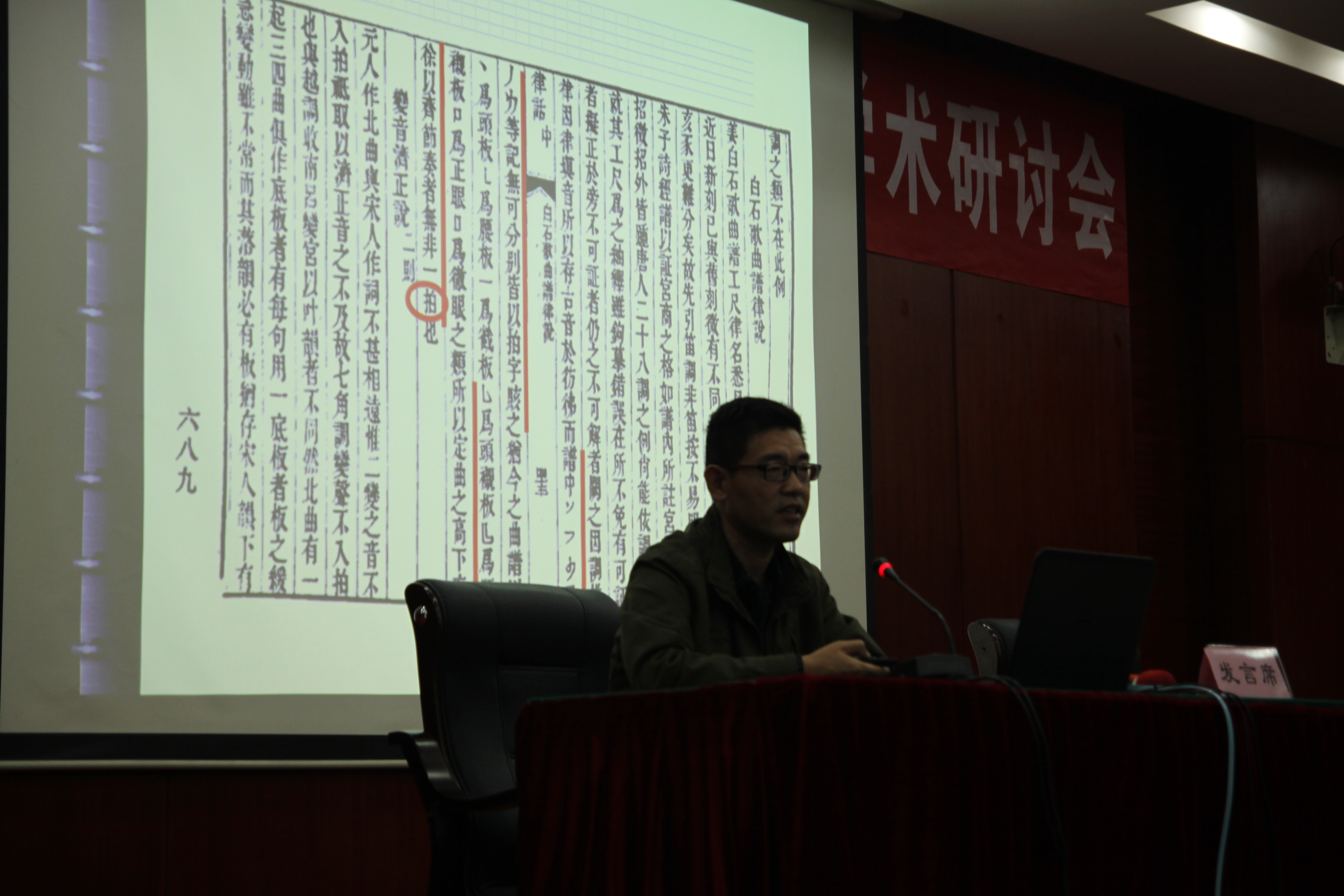 我院赵玉卿教授主持了16日上午的研讨会,并在大会上作了《姜白石俗字谱歌曲译谱之节奏研究》的学术报告。南宋姜夔《白石道人歌曲》对俗字谱的研究具有重要的史学价值,但在学术界中在译解姜白石俗字谱歌曲的节奏节拍方面仍存在着不少分歧。在学术报告中,赵玉卿教授梳理了姜白石俗字谱歌曲之节奏方面的研究观点,在此基础上提出了“一音一拍”“均拍”的新观点。赵玉卿教授认为对白石道人俗字谱歌曲研究之节奏的译解应以“一字一拍”为基础,采用“均拍”的观点划分小节,这样的译解方式更加接近白石道人俗字谱歌曲的原貌。在赵玉卿教授学术报告中提出的新观点引起了在座专家学者们的广泛关注,产生了较大的学术影响,得到了专家们的一致好评。