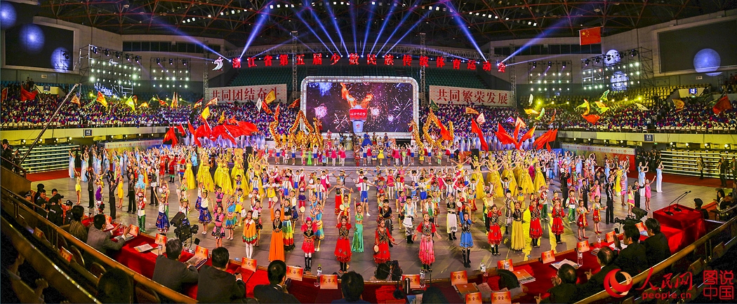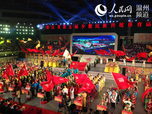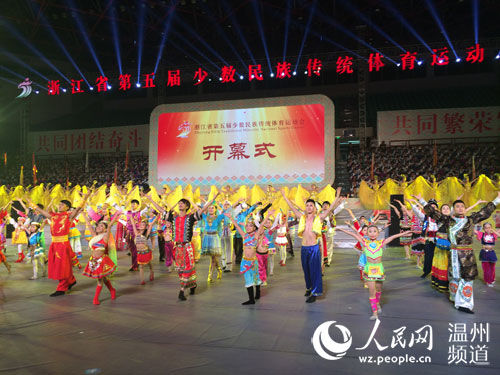 开幕式现场,灯火璀璨,流光溢彩。身着56个民族特色服饰的演员们载歌载舞,精彩纷呈,到场市民不时报以热烈的掌声。这是温州首次承办浙江省少数民族运动会。运动会赛期3天,共有来自全省12个代表团涉及24个民族的665名运动员参加。与大众体育运动会不同的是,少数民族运动会的比赛项目带着鲜明的民族特色,既有竞争性,又兼观赏性。本届运动会以“最炫民族风,最浓浙江情”为口号,设置了竞赛项目和表演项目两大类,将在温州市体育中心、毒舌电影